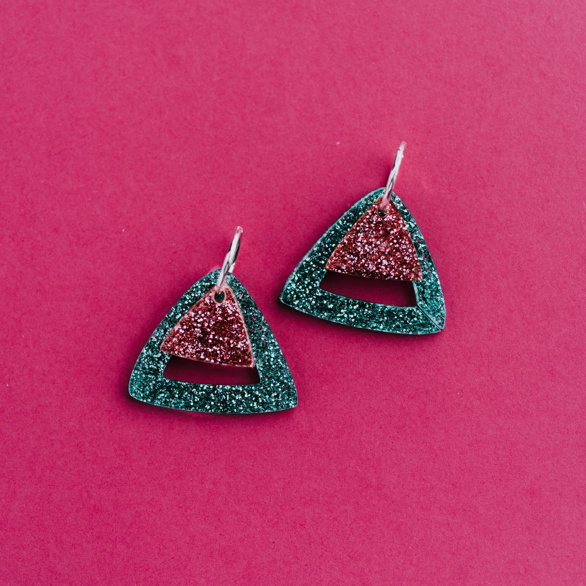 Pink and Teal Glitter Large triangle and sterling silver hoop earrings