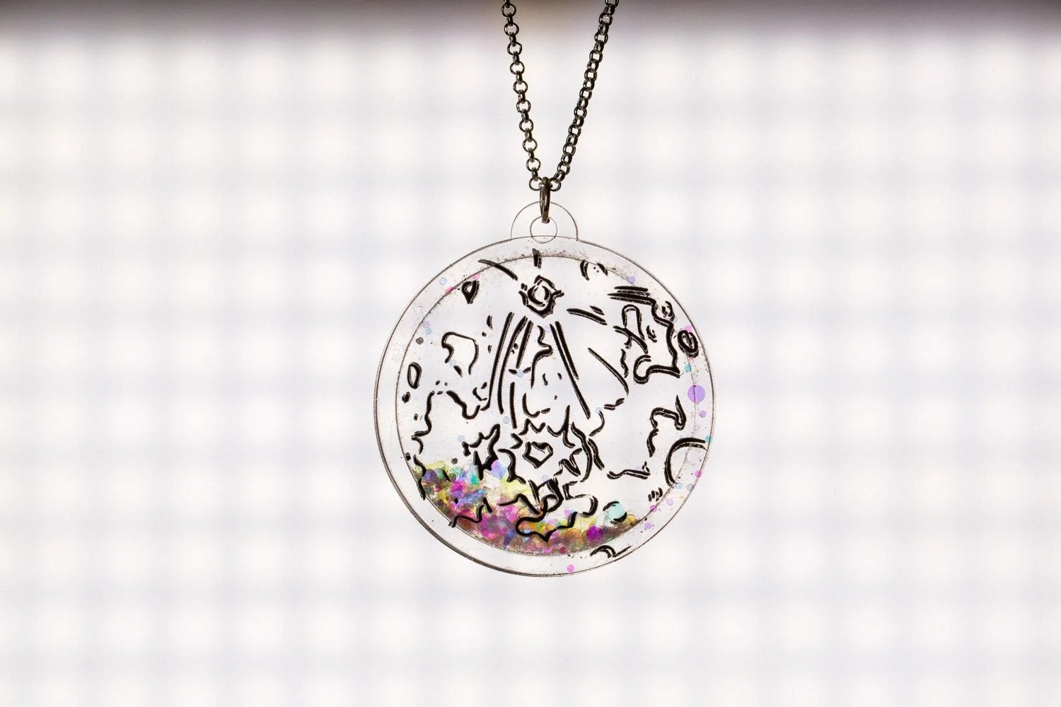 Each side of the transparent acrylic moon has hand inked moonscape details that contrasts against the shimmery sparkle inside. As the moon moves the glitter shimmers the spectrum of rainbow colours, making for a statement necklace.