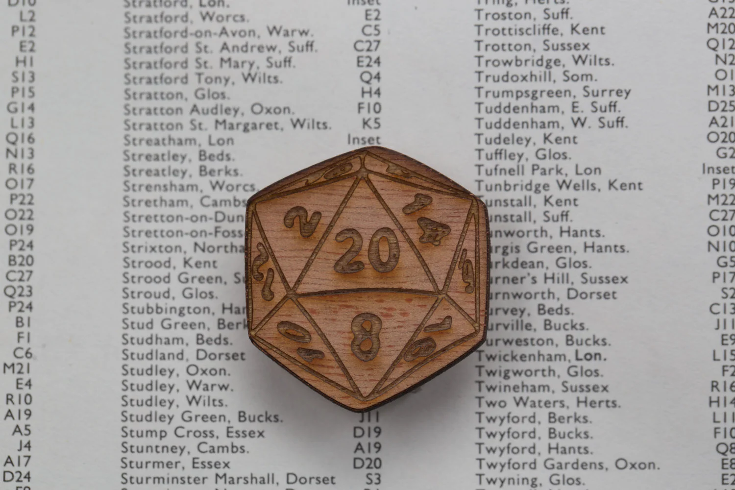 D20 dice pin badge for all adventuring geeks ~ wooden laser cut brooch