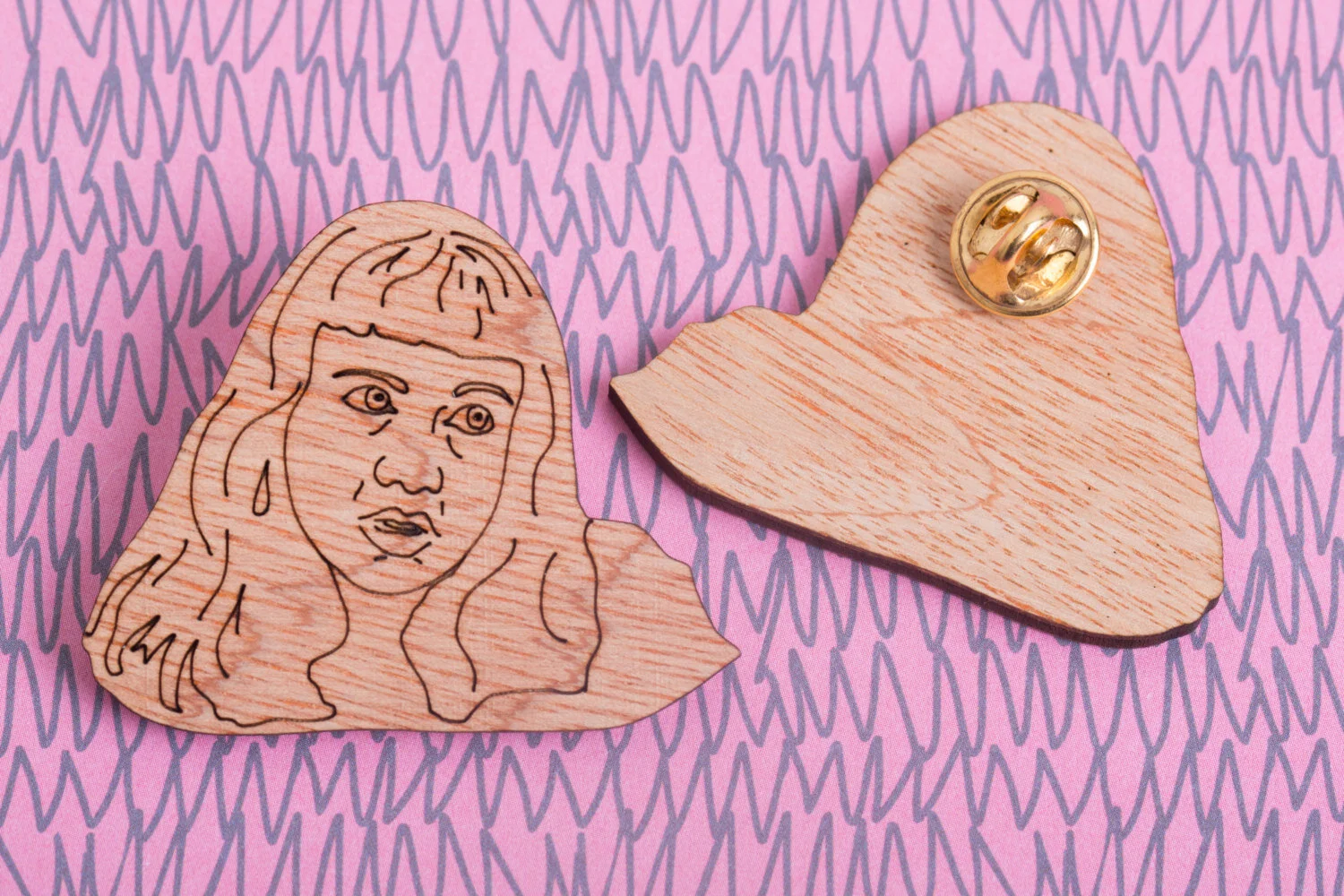 Hand drawn before Bertha, our laser, lovingly etched those unimpressed eyes and that blunt fringe, Janeane can be pinned to your clothes by a brass plated clutch back for true 90s pin game.