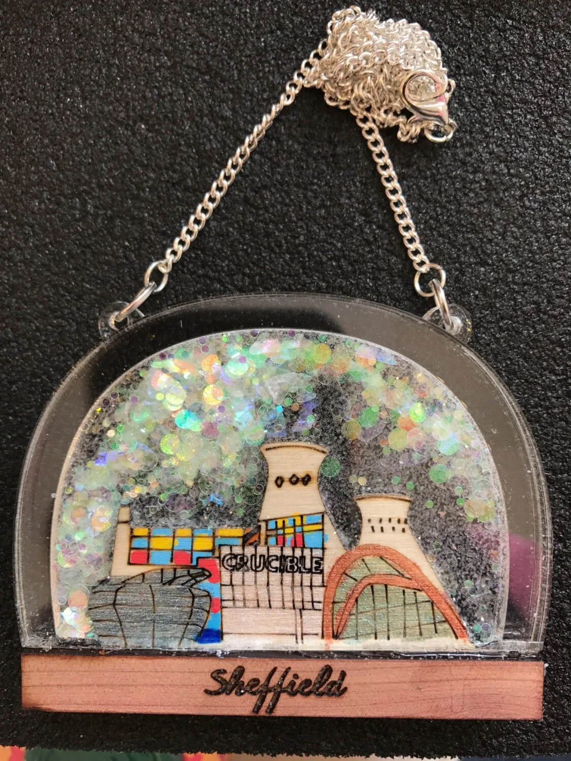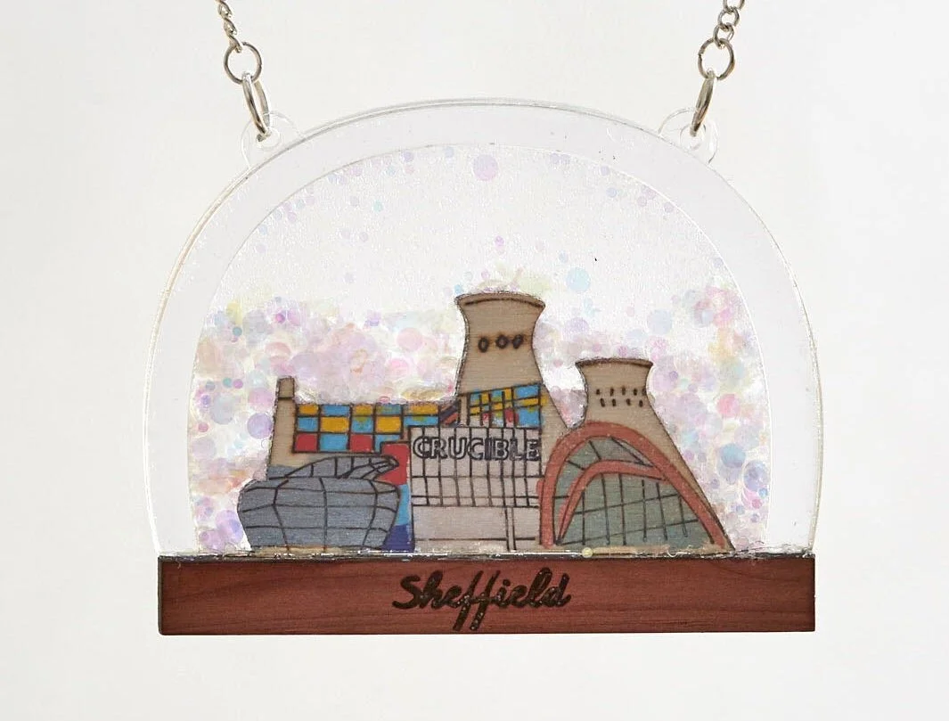 Sheffield landmarks old and new adorn the glittery snow filled landscape of our Sheffield snow globe necklace, including the Crucible, Winter Gardens, and the fondly remembered looming chimneys of Tinsley Viaduct.