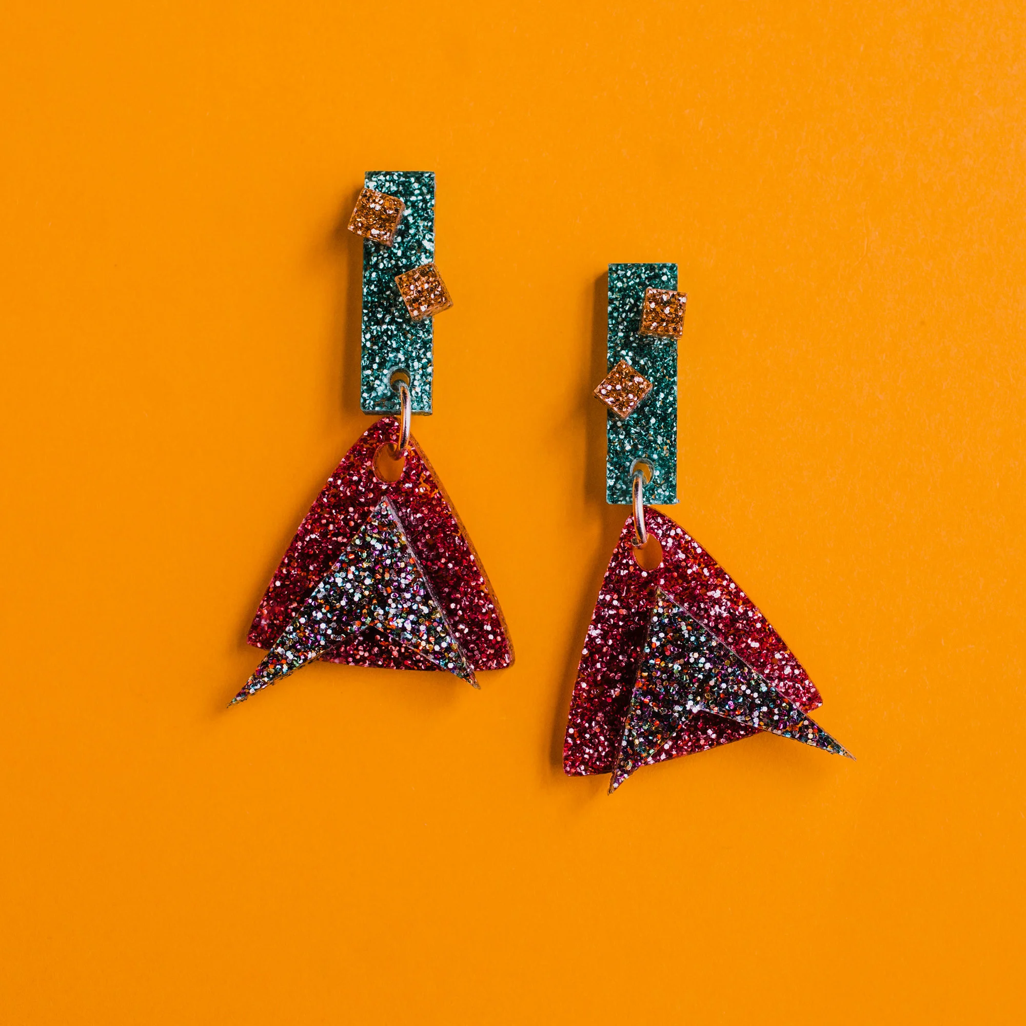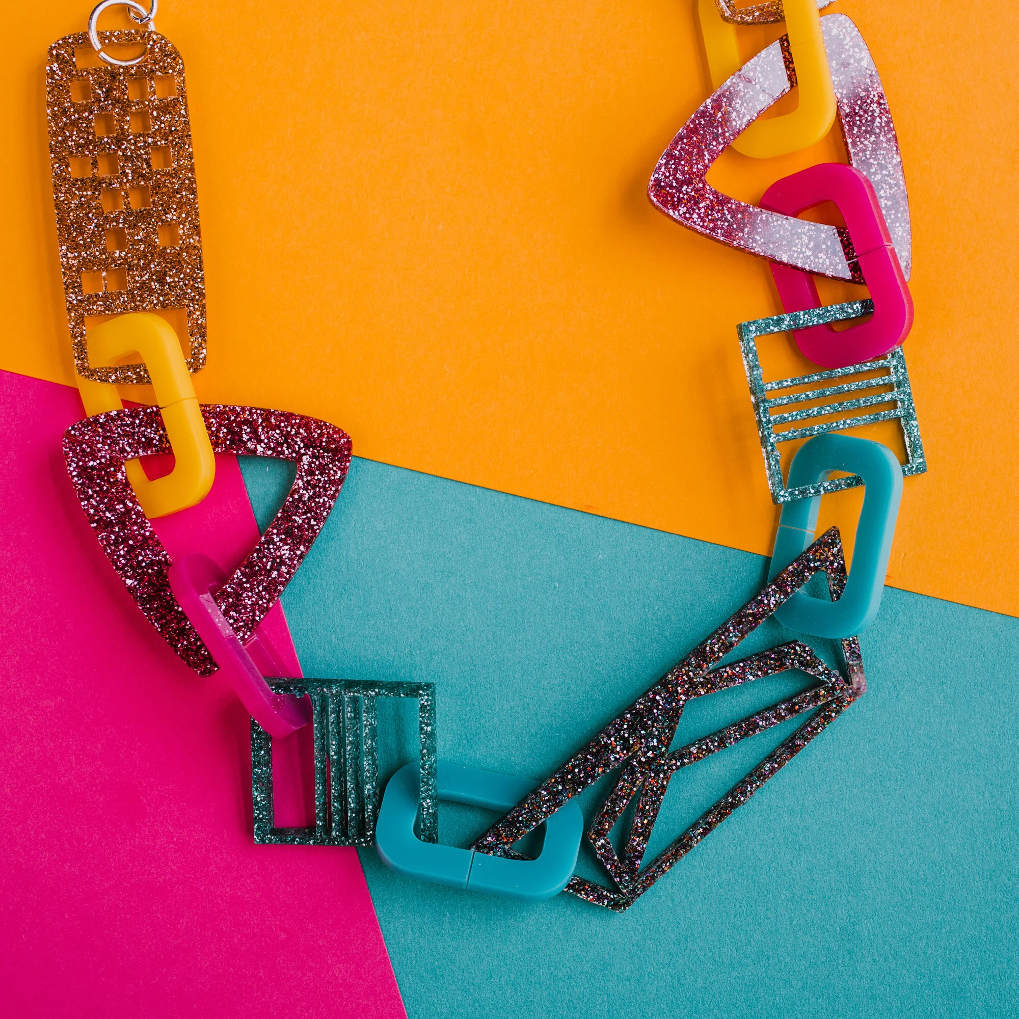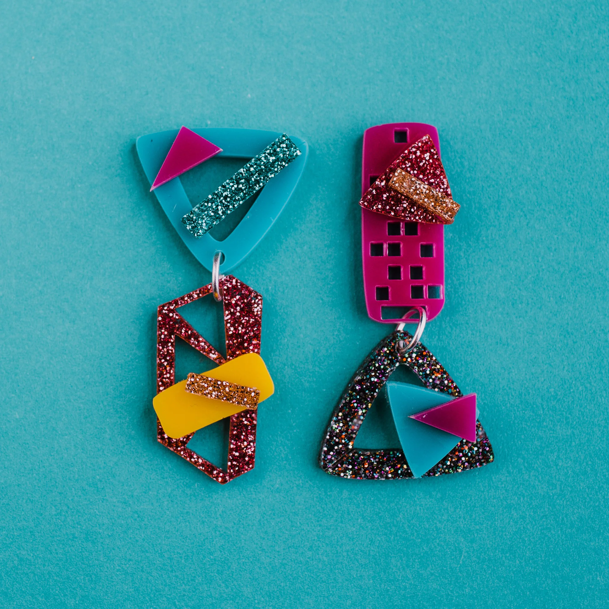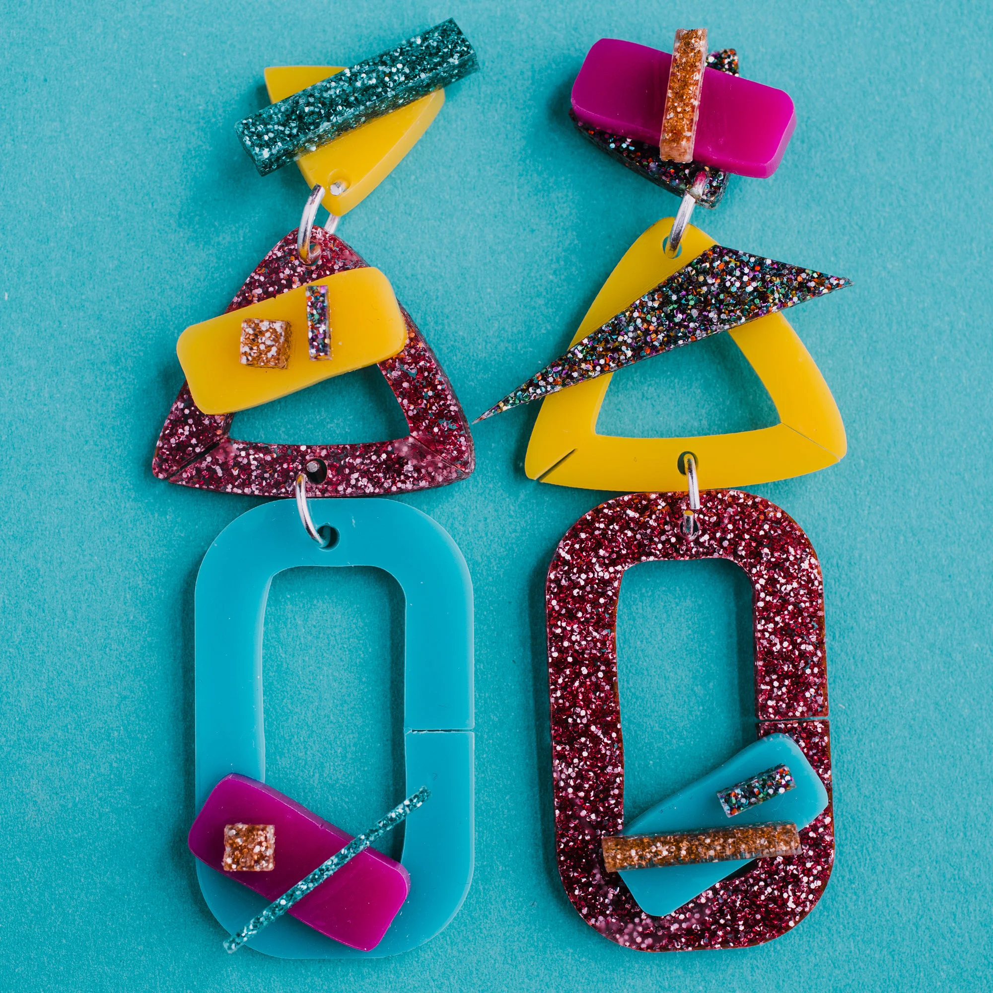 The Memphis Collection has a range of statement laser cut dangly earrings combining magenta, cyan and yellow colour palette with their glittery counter acrylic counterparts.