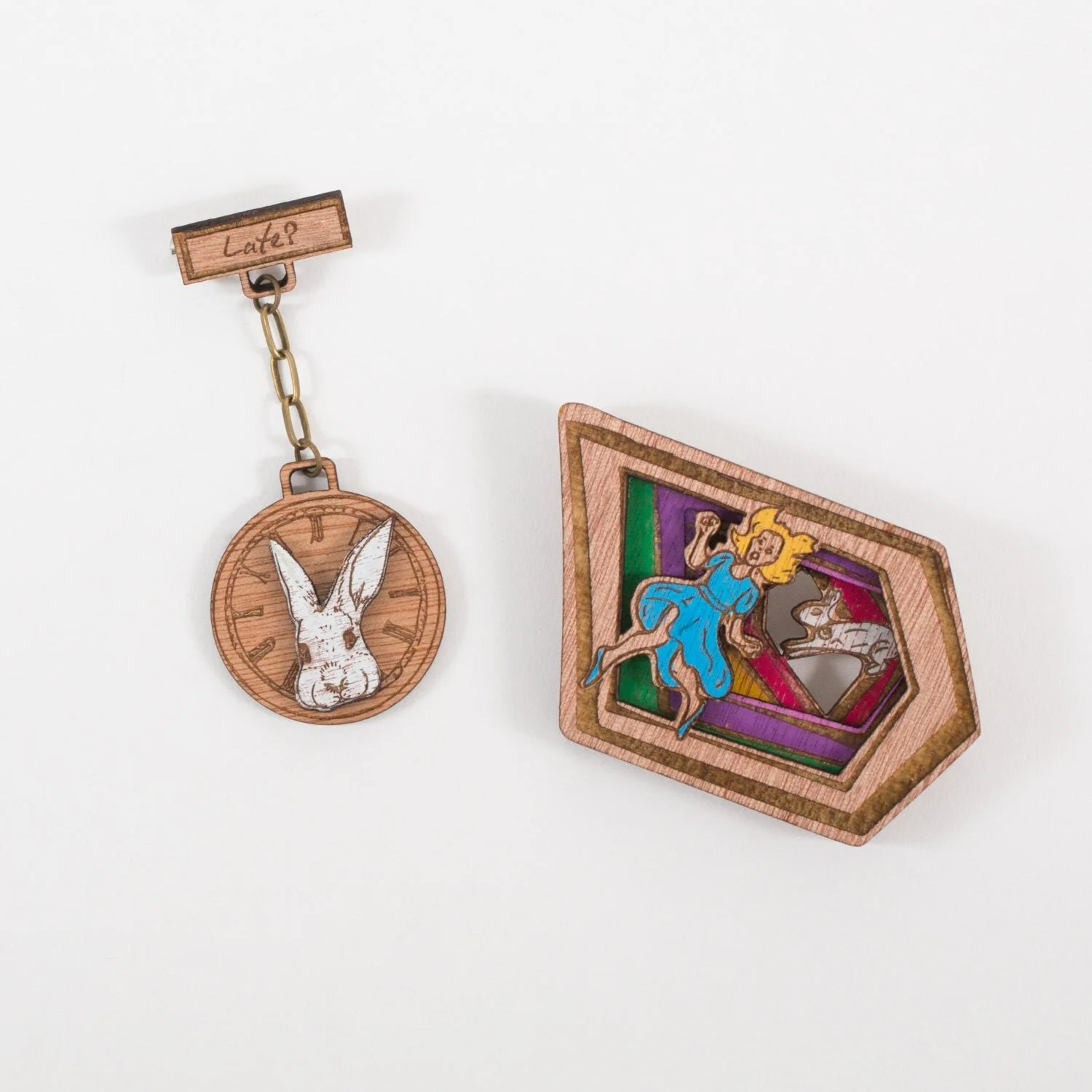 Alice in Wonderland jewelry, White Rabbit Pocket Watch wooden brooch - rabbit pin badge, always late, gift for book lovers, lewis caroll