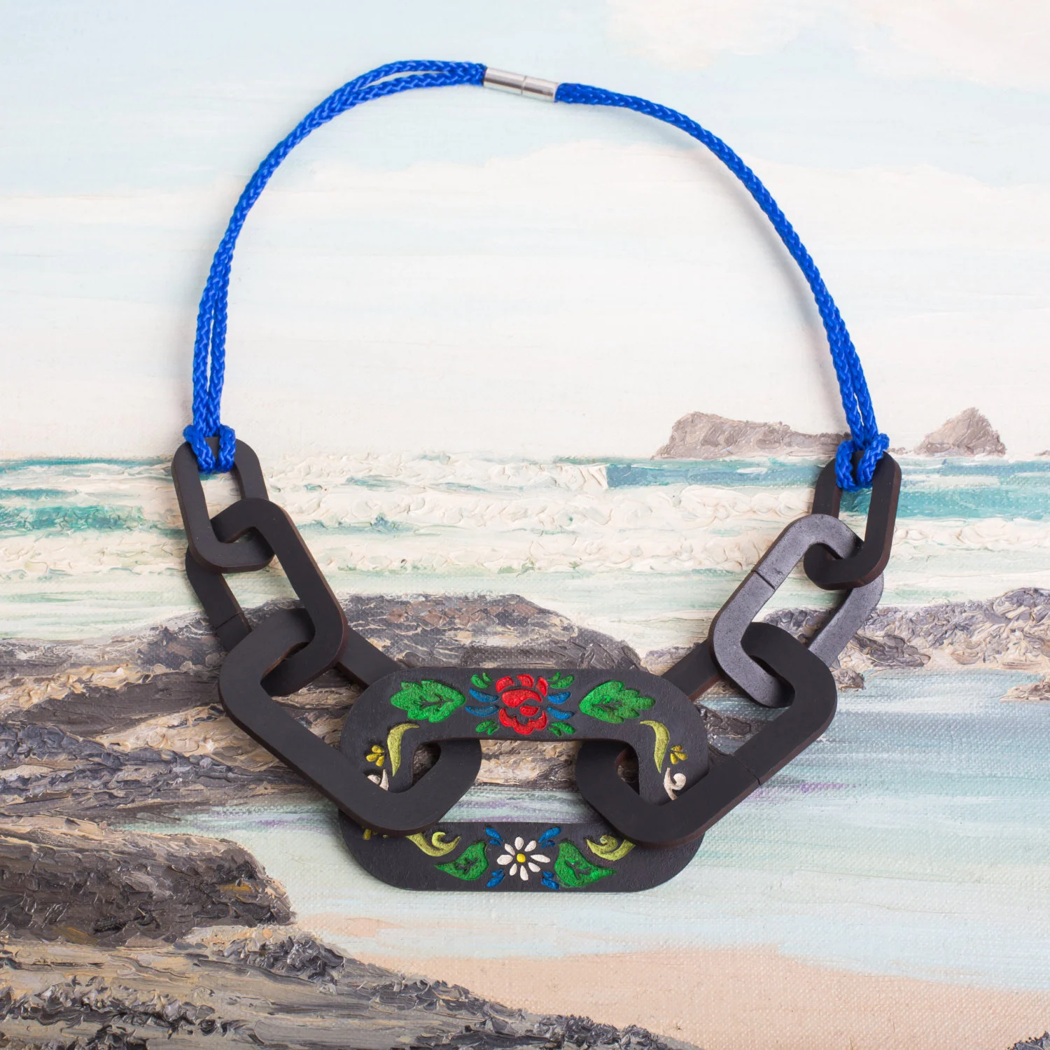 Our Black Country Chain Necklace features an original canal-inspired hand-painted design on interlocking links.  Bright blue rope connects to a magnetic fastening to complete the piece.