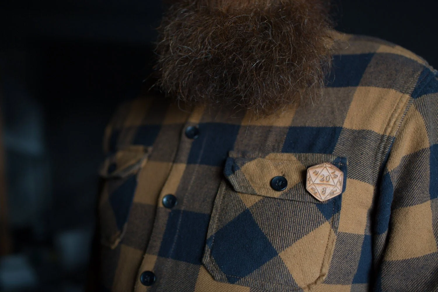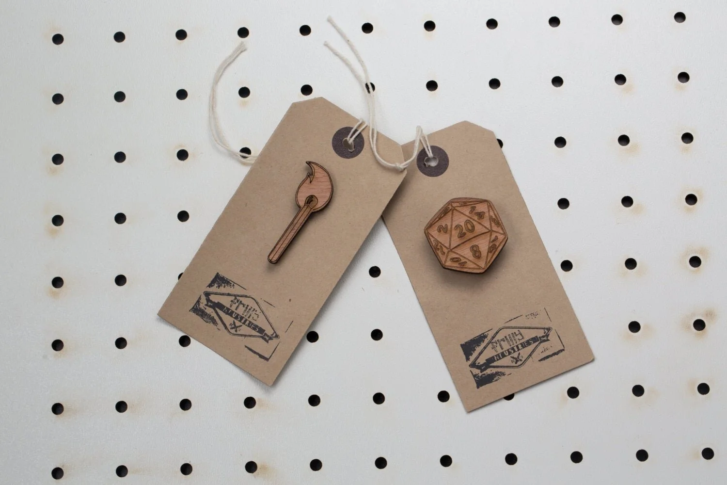 D20 dice pin badge for all adventuring geeks ~ wooden laser cut brooch