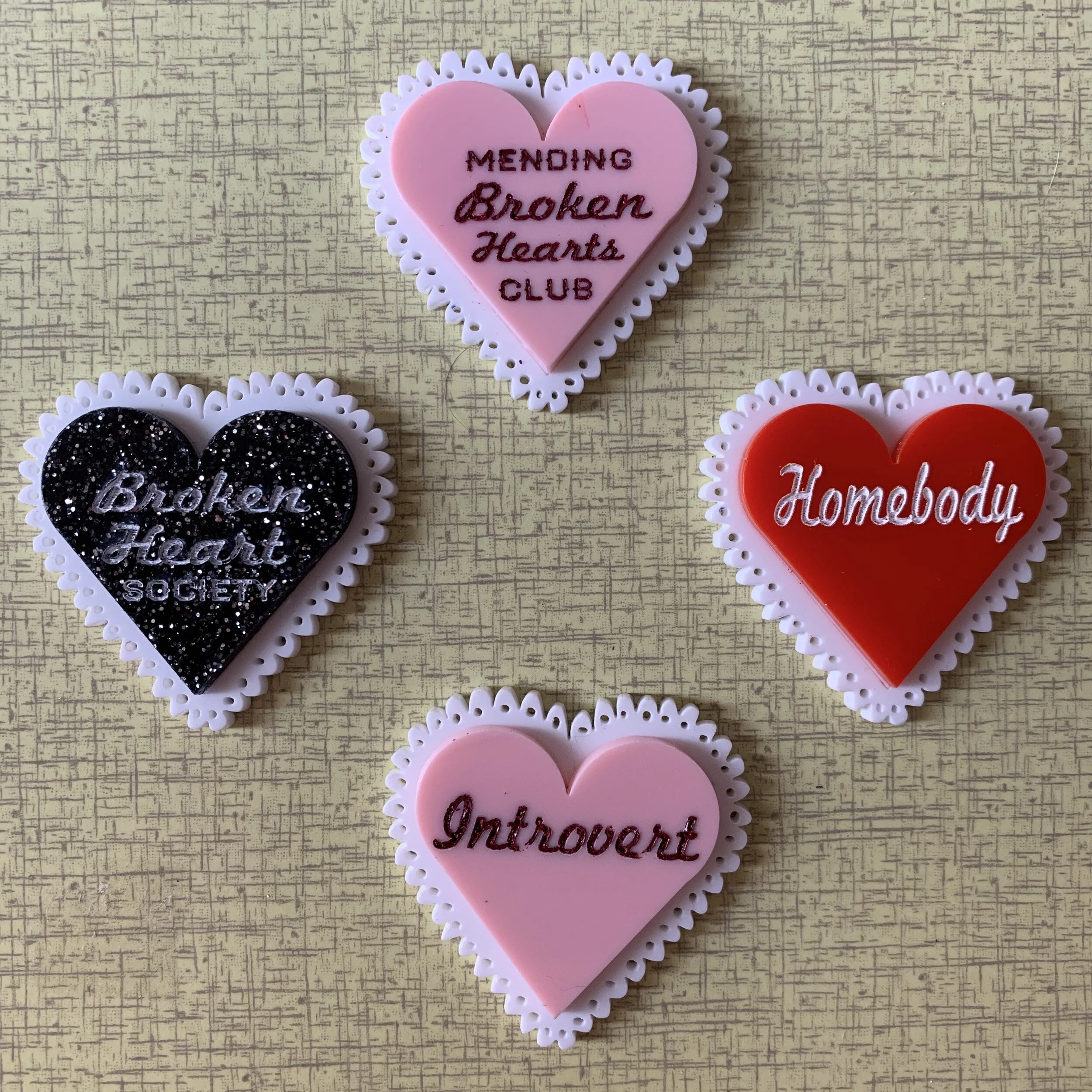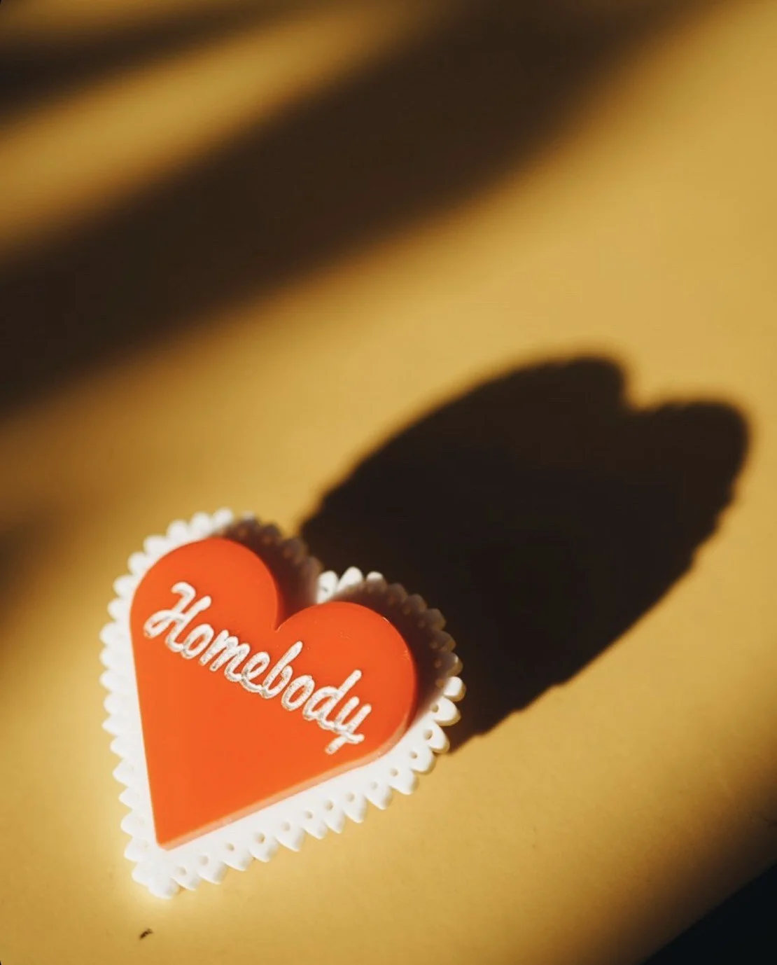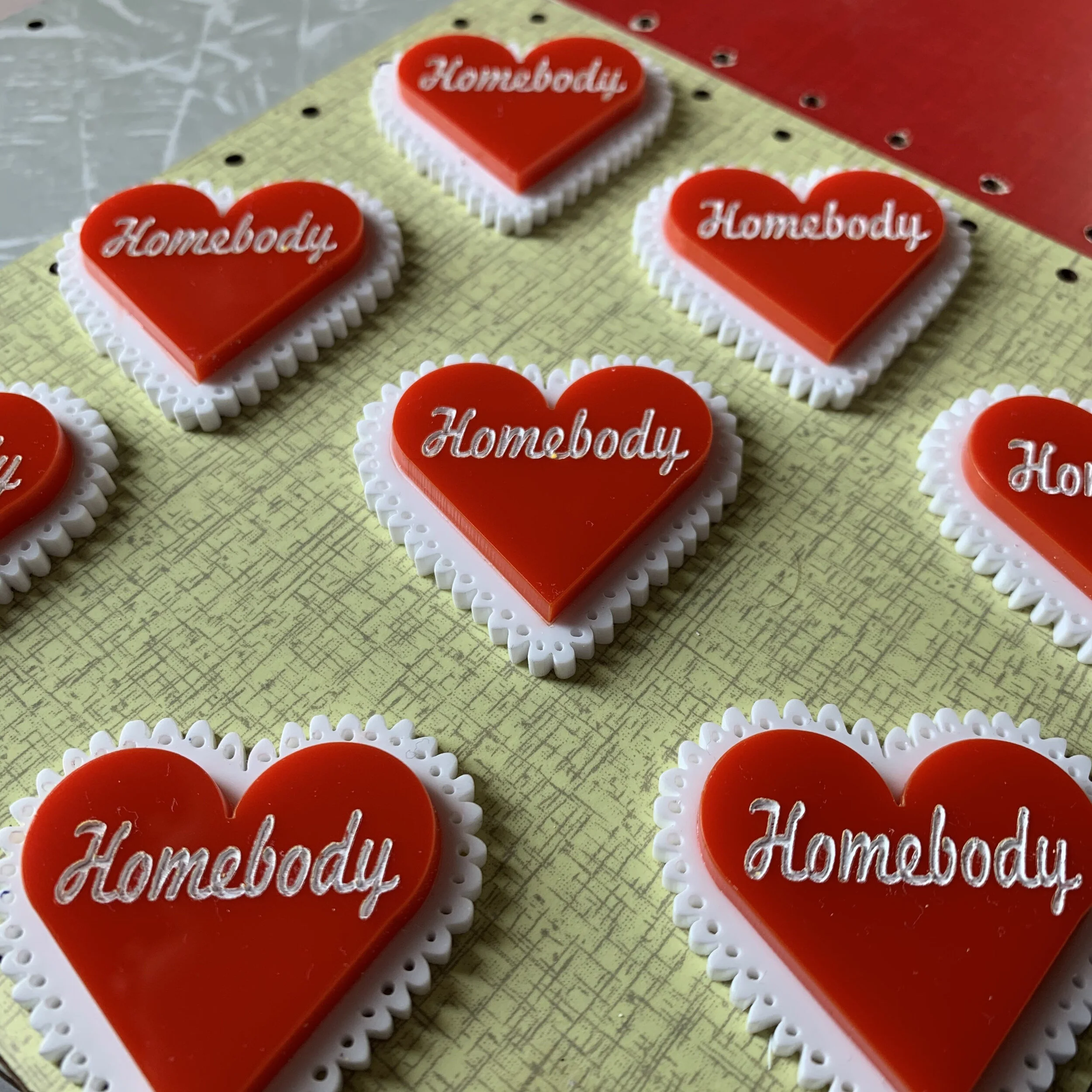This Homebody sweetheart laser cut pin brooch celebrates the joy of staying home.