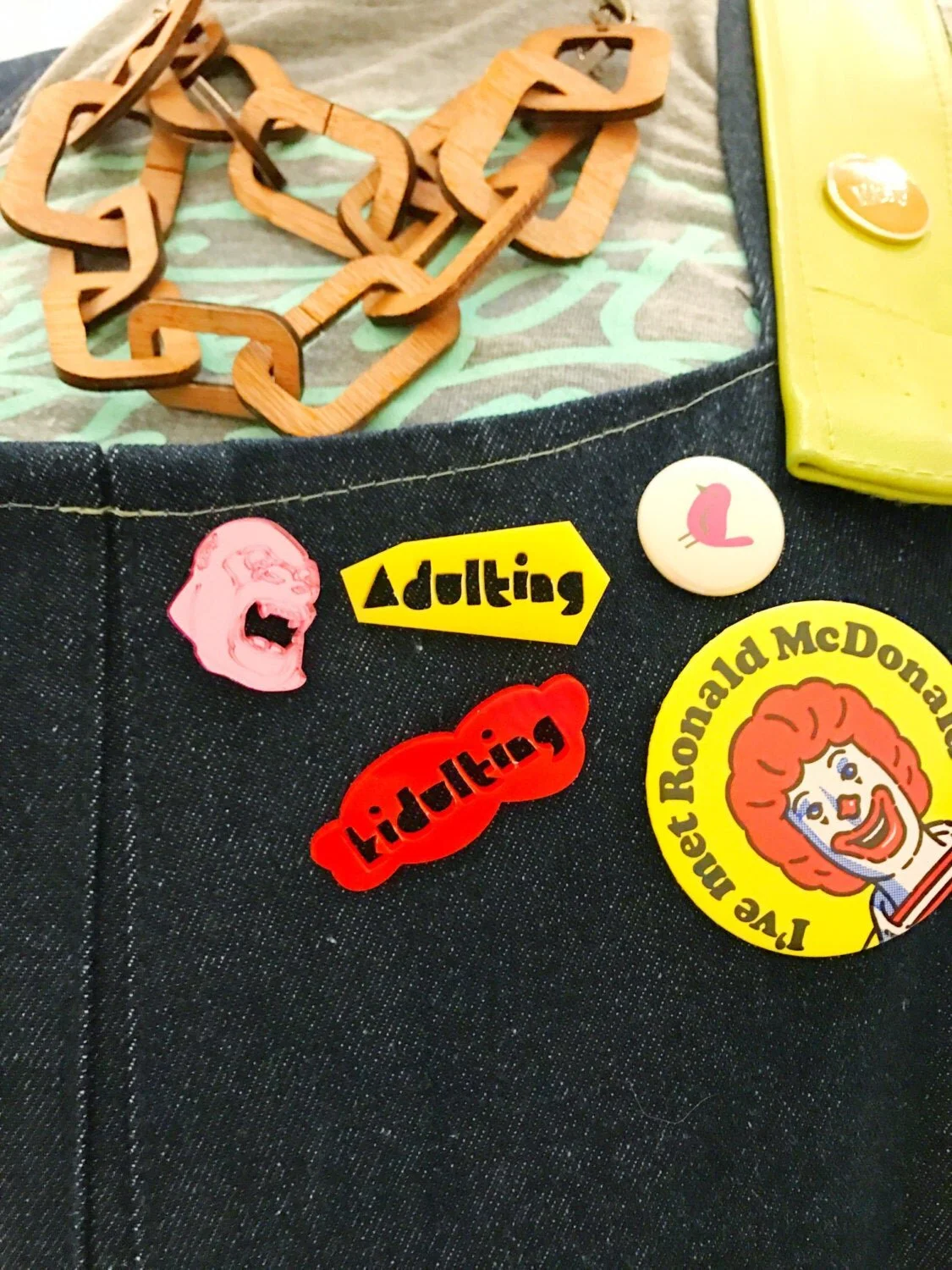 Kidulting / Adulting chunky colourful acrylic pins - playful typography - 80s style - primary colours