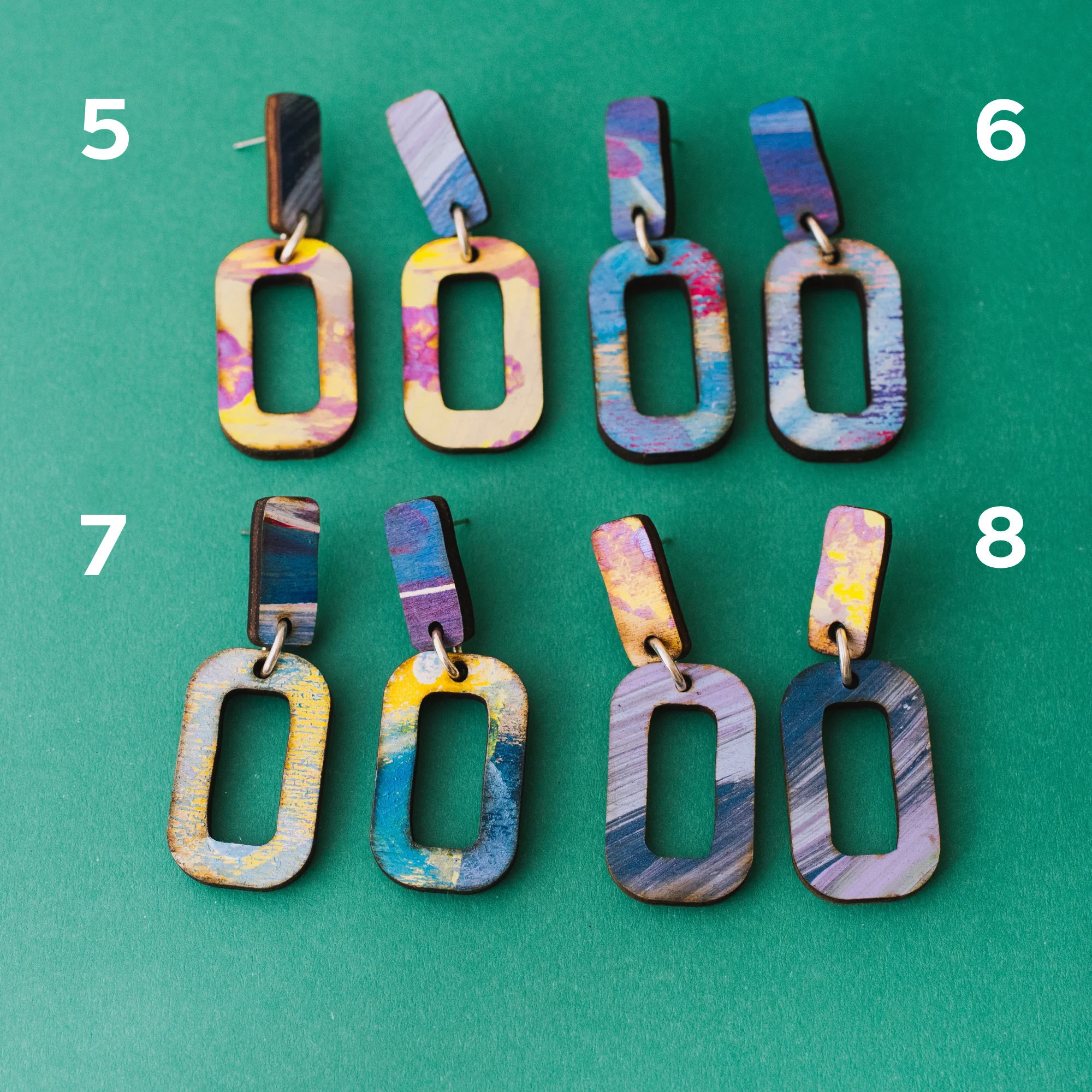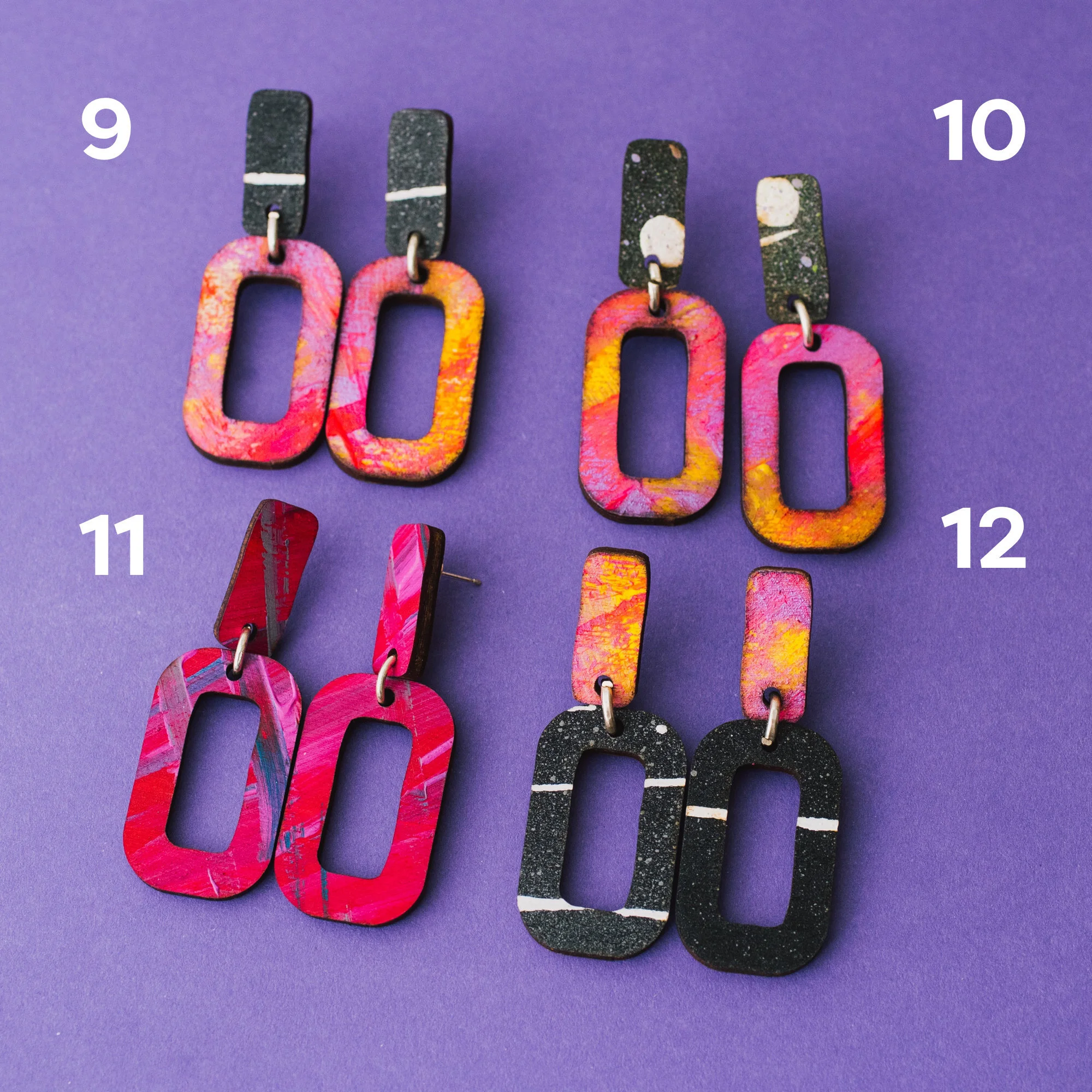 These earrings match chunky chain necklaces and are all about minimising waste and ensuring all parts of the painted wood are used, minimising waste.