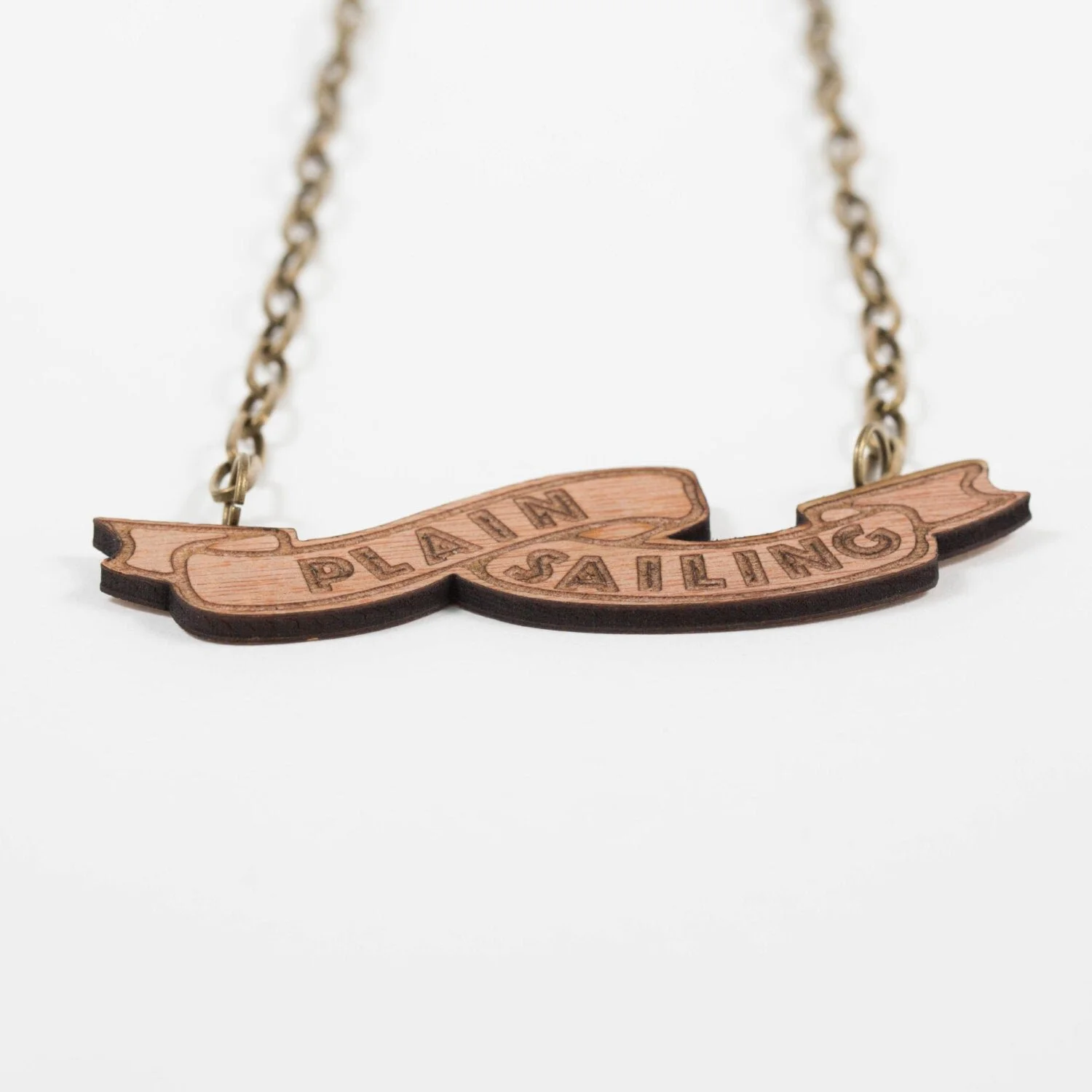 A Plain Sailing wooden scroll necklace for seafaring occasions, nautical adventures and sailing shenanigans with sailors and pirates.
