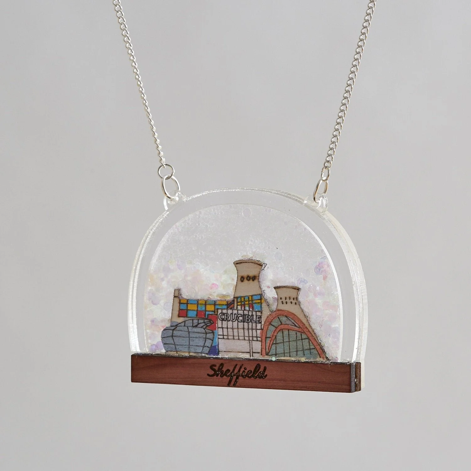 Sheffield landmarks old and new adorn the glittery snow filled landscape of our Sheffield snow globe necklace, including the Crucible, Winter Gardens, and the fondly remembered looming chimneys of Tinsley Viaduct.