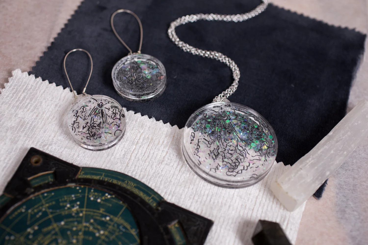 Each side of the transparent acrylic moon has hand inked moonscape details that contrasts against the shimmery sparkle inside. As the moon moves the glitter shimmers the spectrum of rainbow colours, making for a statement necklace.