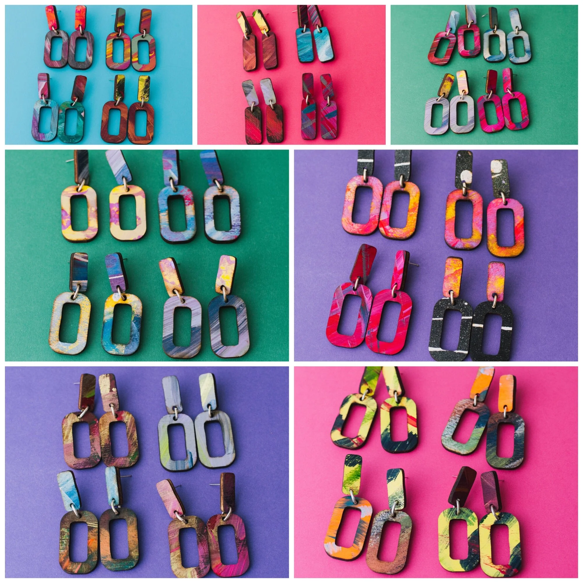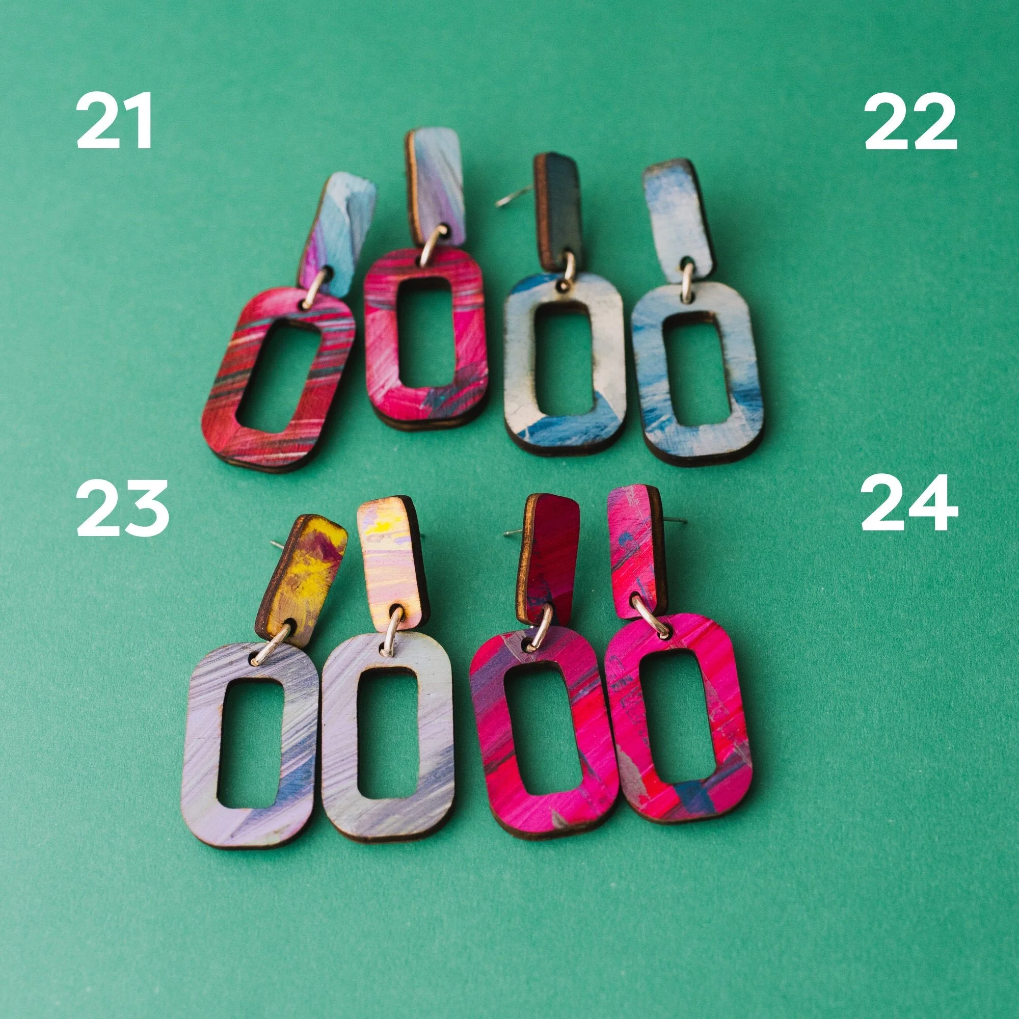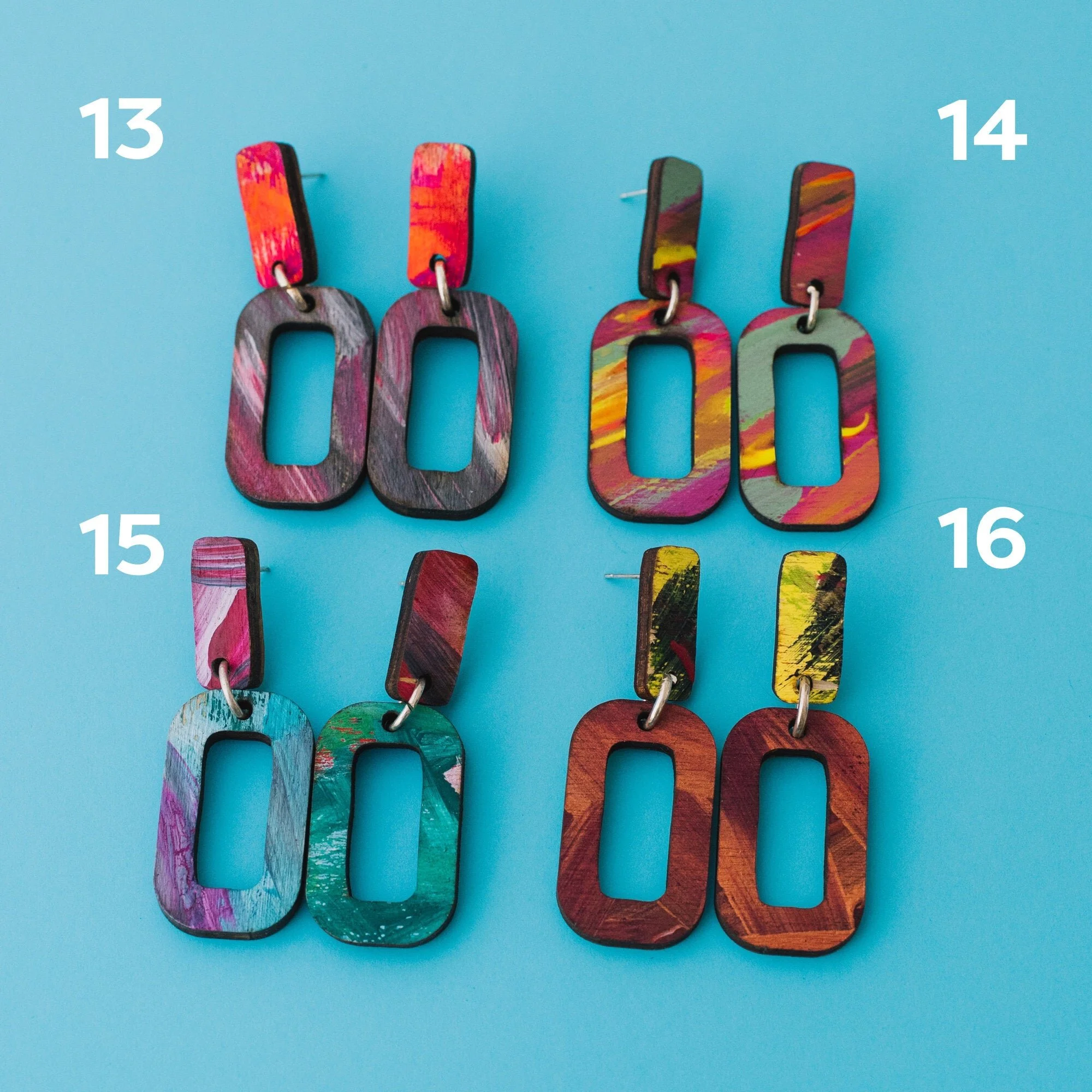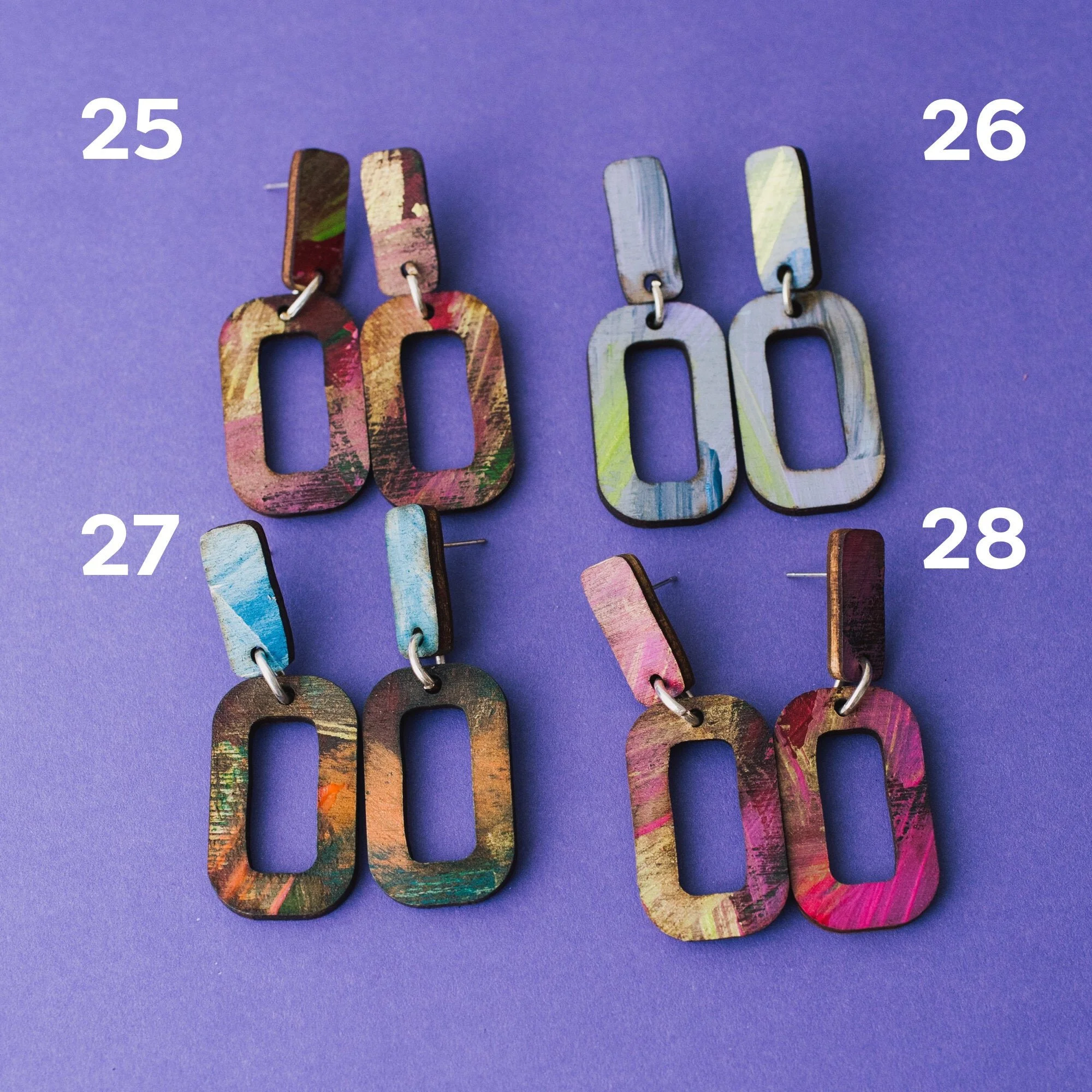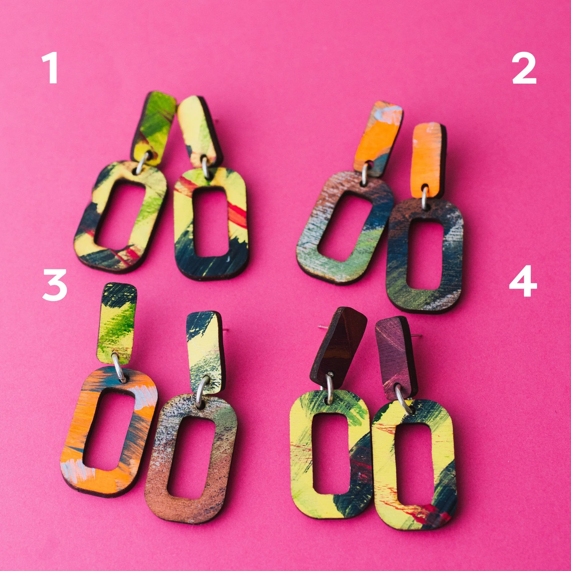 These earrings match chunky chain necklaces and are all about minimising waste and ensuring all parts of the painted wood are used, minimising waste.
