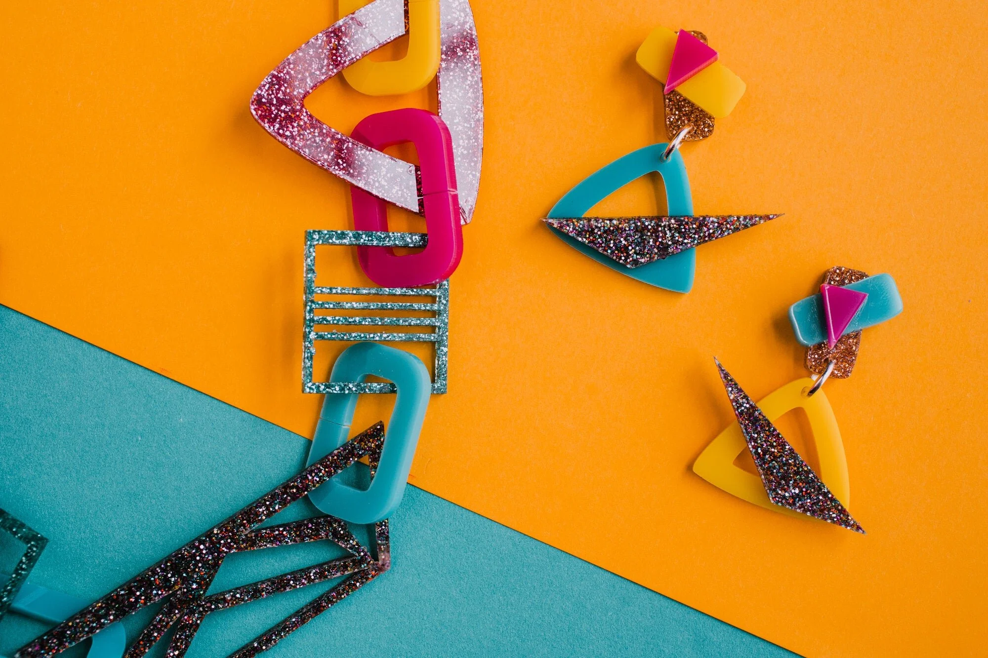 The Memphis Collection Chunky Chain Necklace is a statement piece. It also has a range of dangly earrings all combining magenta, cyan and yellow colour palette with their glittery counter acrylic counterparts.