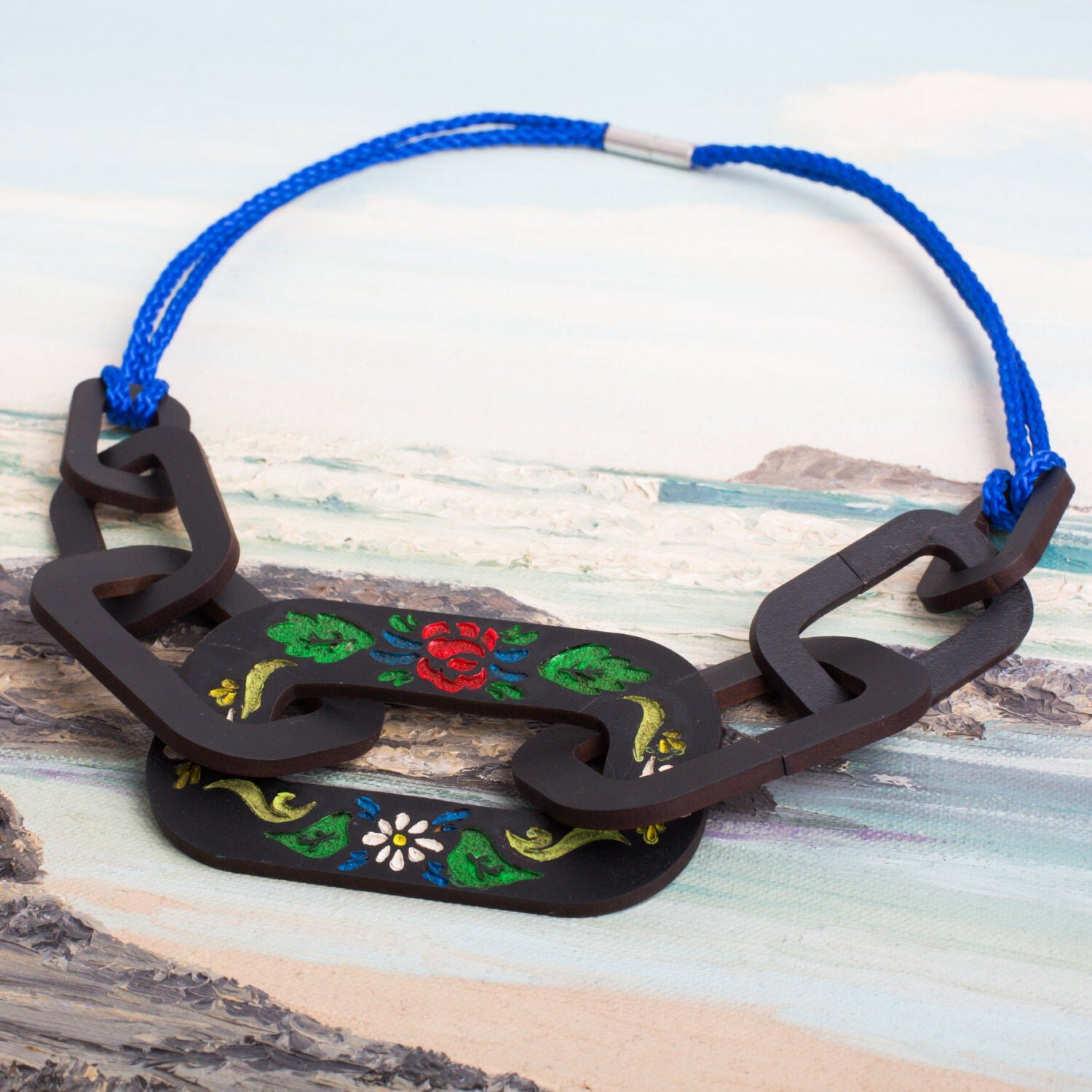 Our Black Country Chain Necklace features an original canal-inspired hand-painted design on interlocking links. Bright blue rope connects to a magnetic fastening to complete the piece.