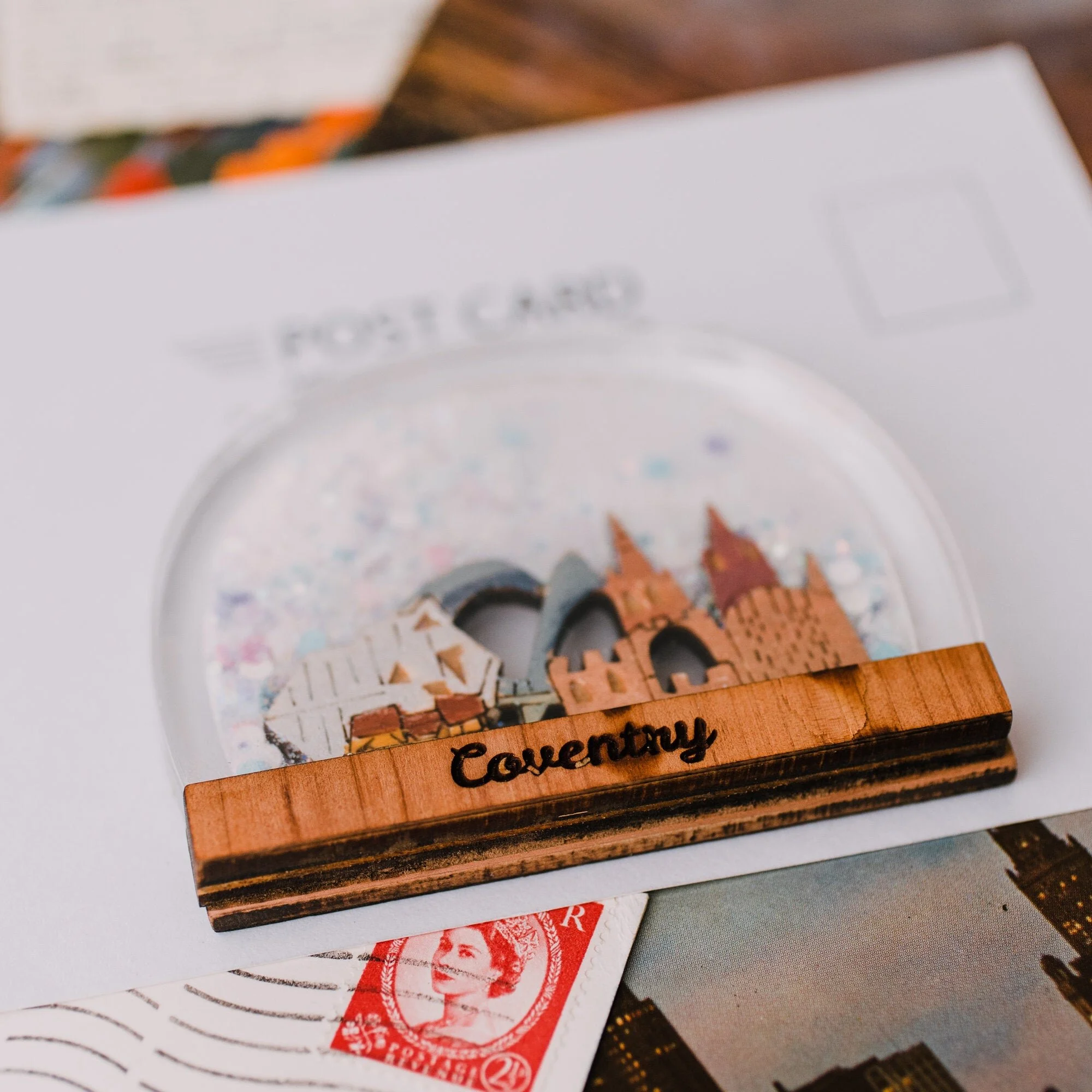 Coventry landmarks surrounded by glittery snow in this snow globe necklace.