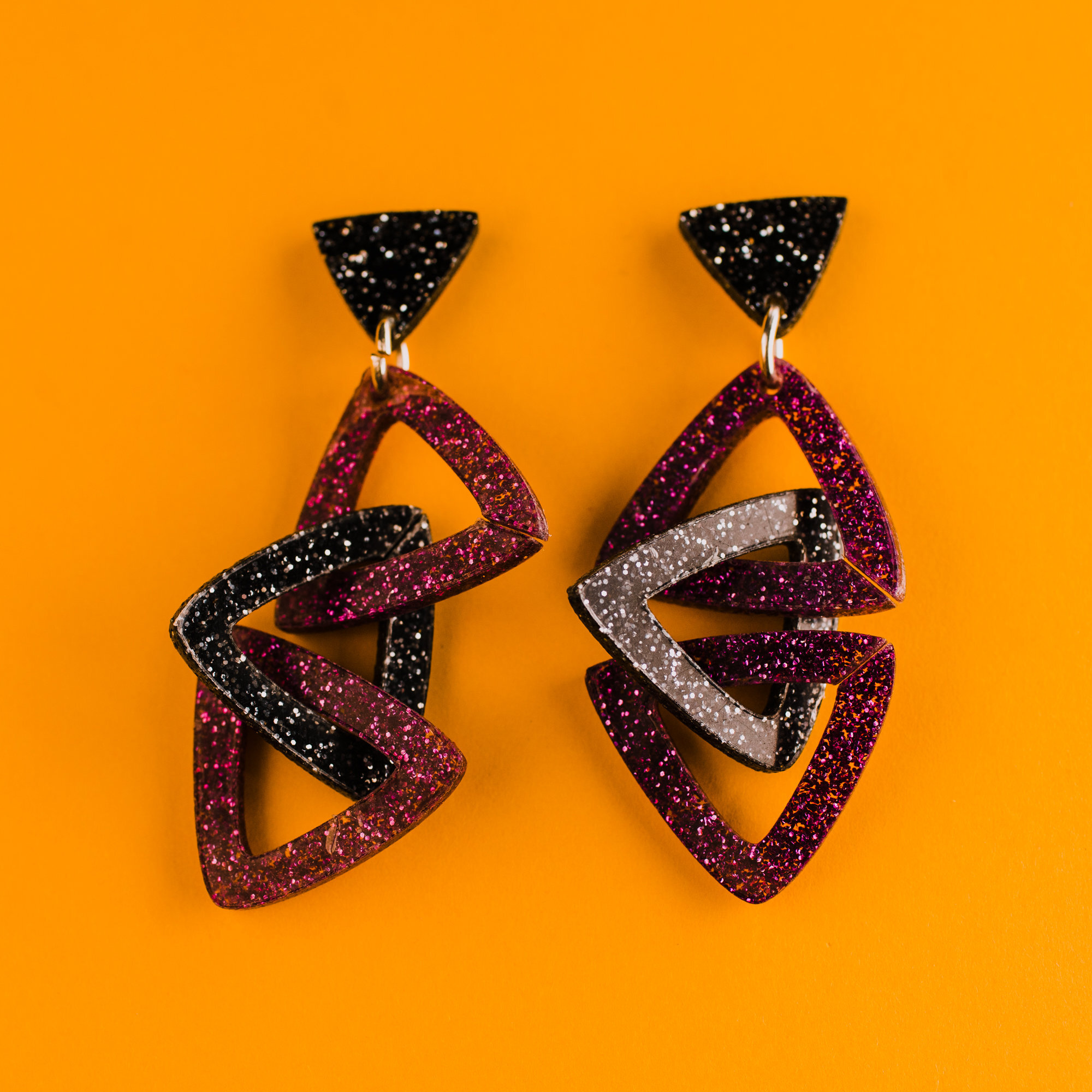 Statement laser cut acrylic triangle earrings in black rainbow glitter, a purple and black glitter combo or a red marble and black option.