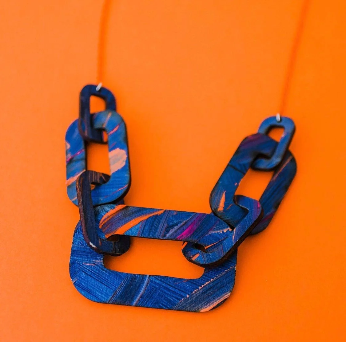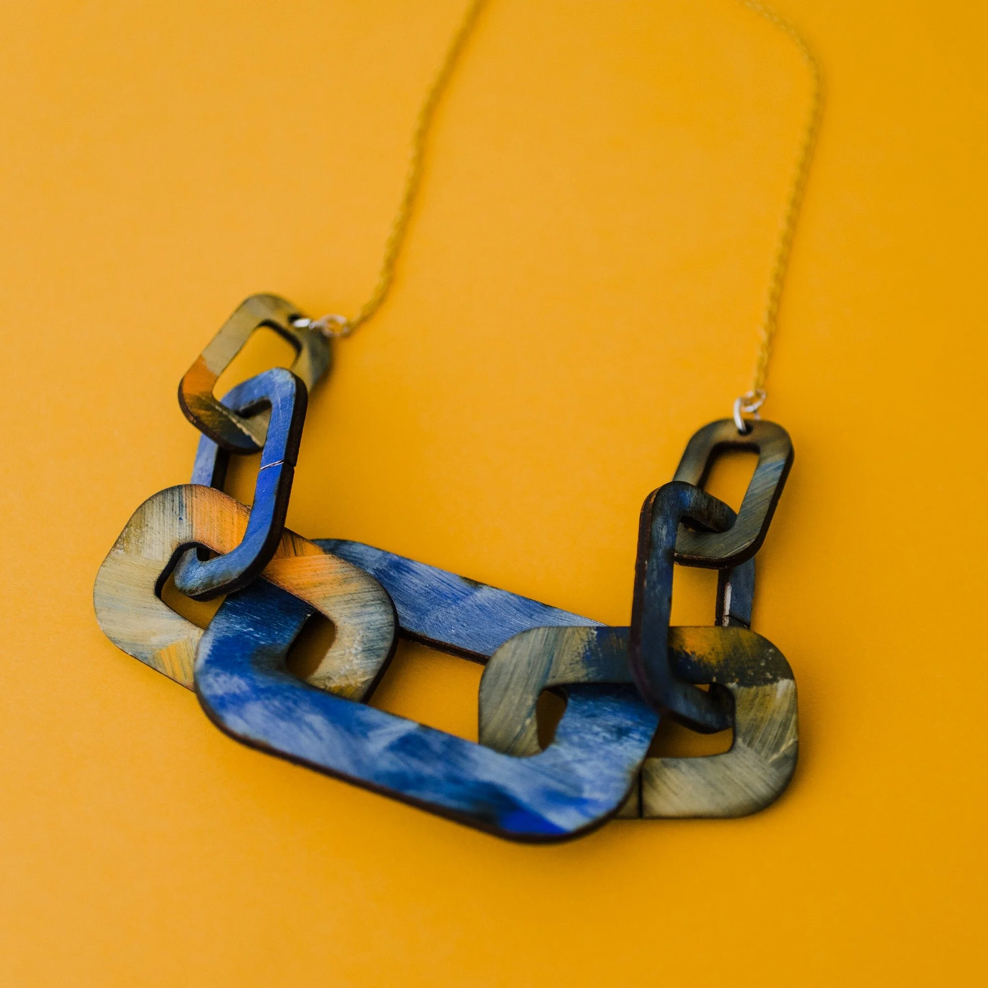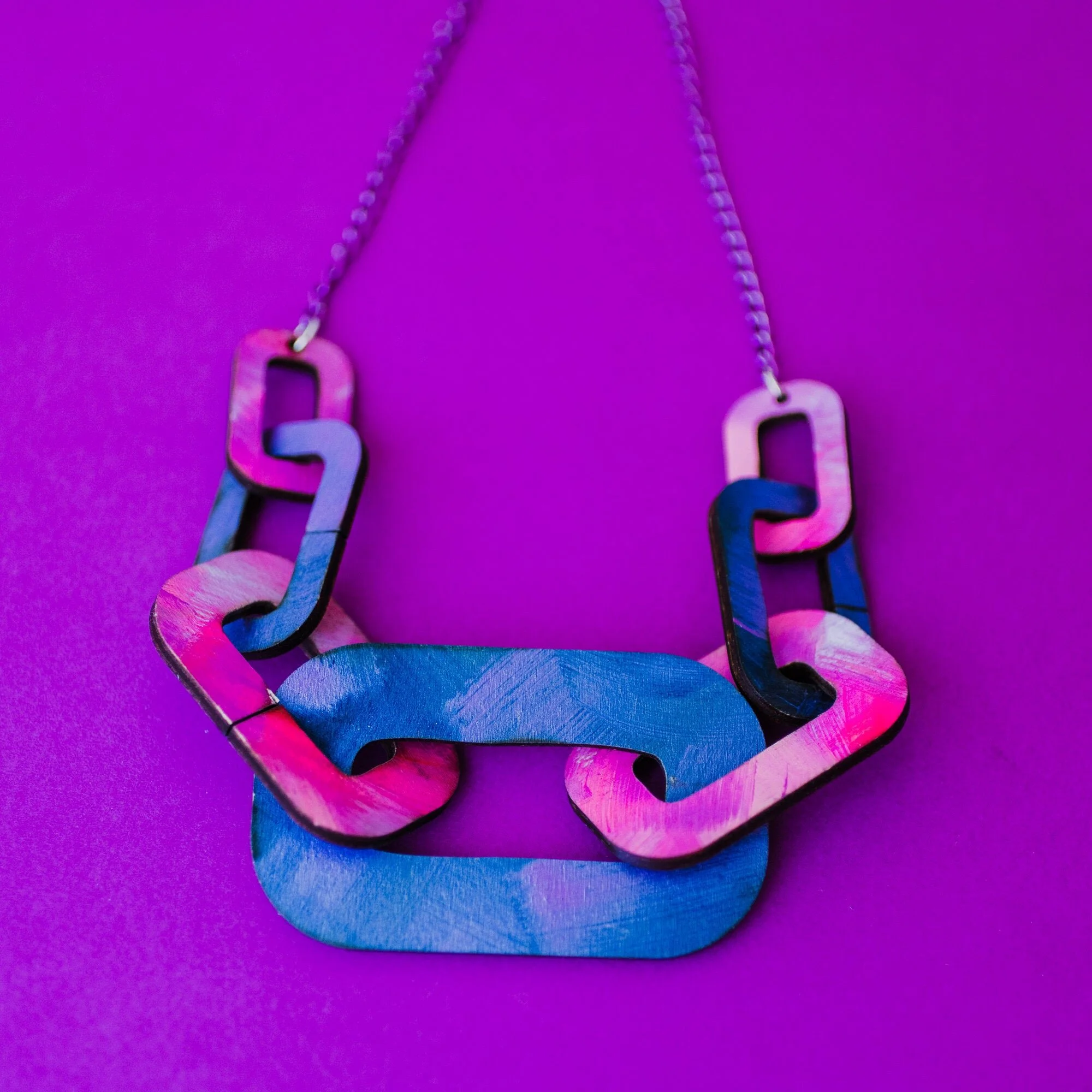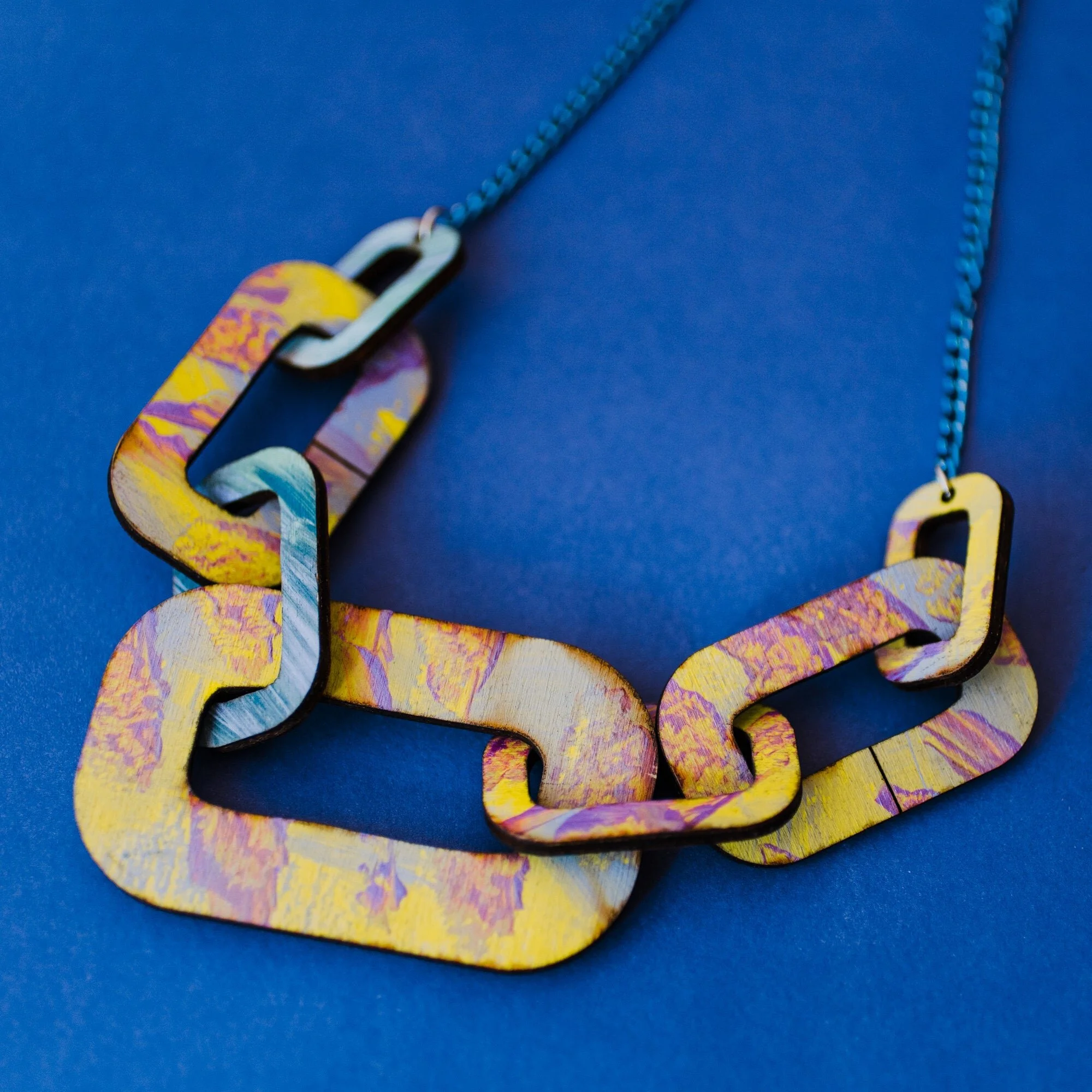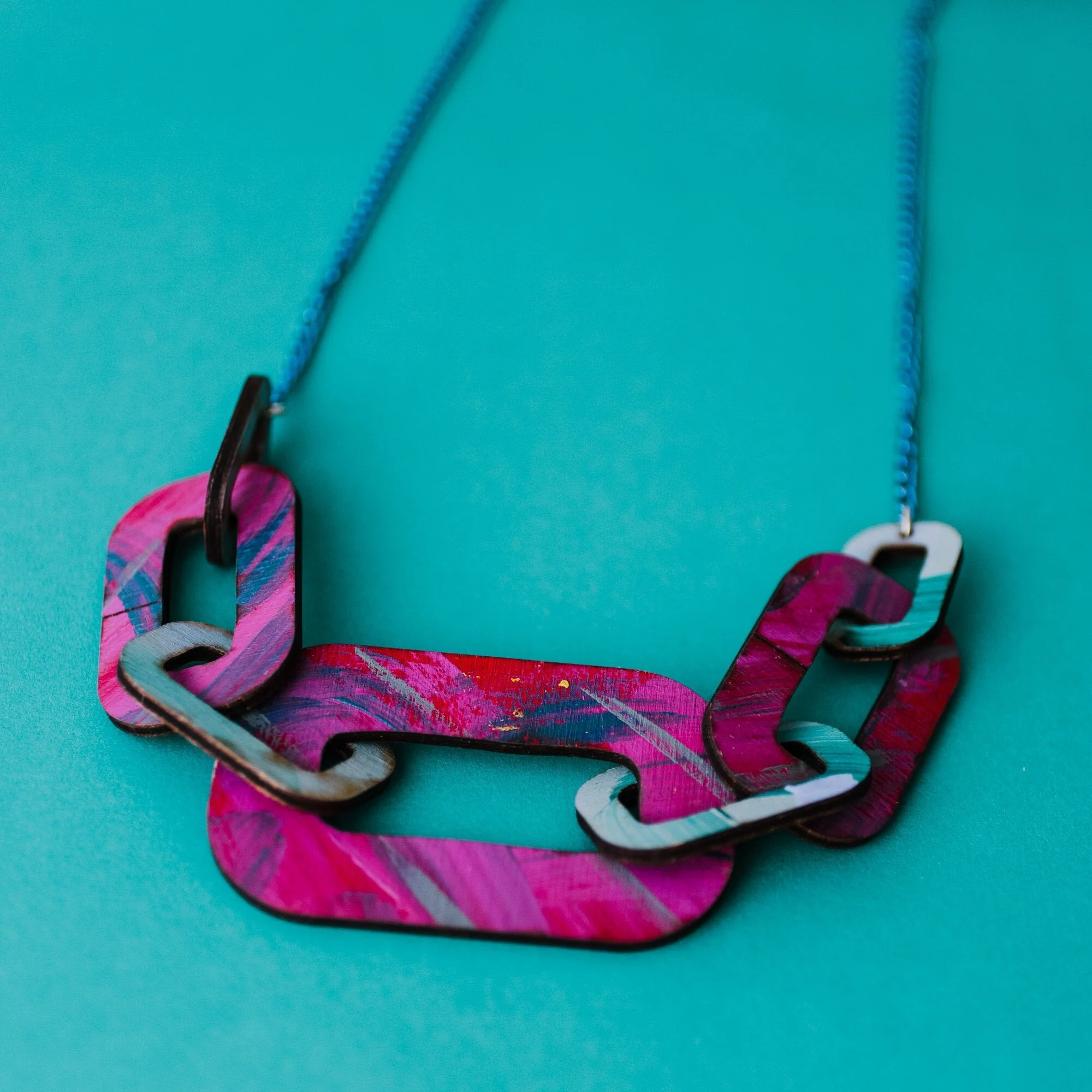 Transforming the classic wooden chain necklace and making it bolder and brighter with handpainted colour palettes to make a statement: big, chunky wooden chain links paired with a lightweight, contrqasting aluminium coloured chain. Looks great against any colour garment, it makes Summer delicate floaty dresses look powerful and pops against Winter rollneck sweaters.