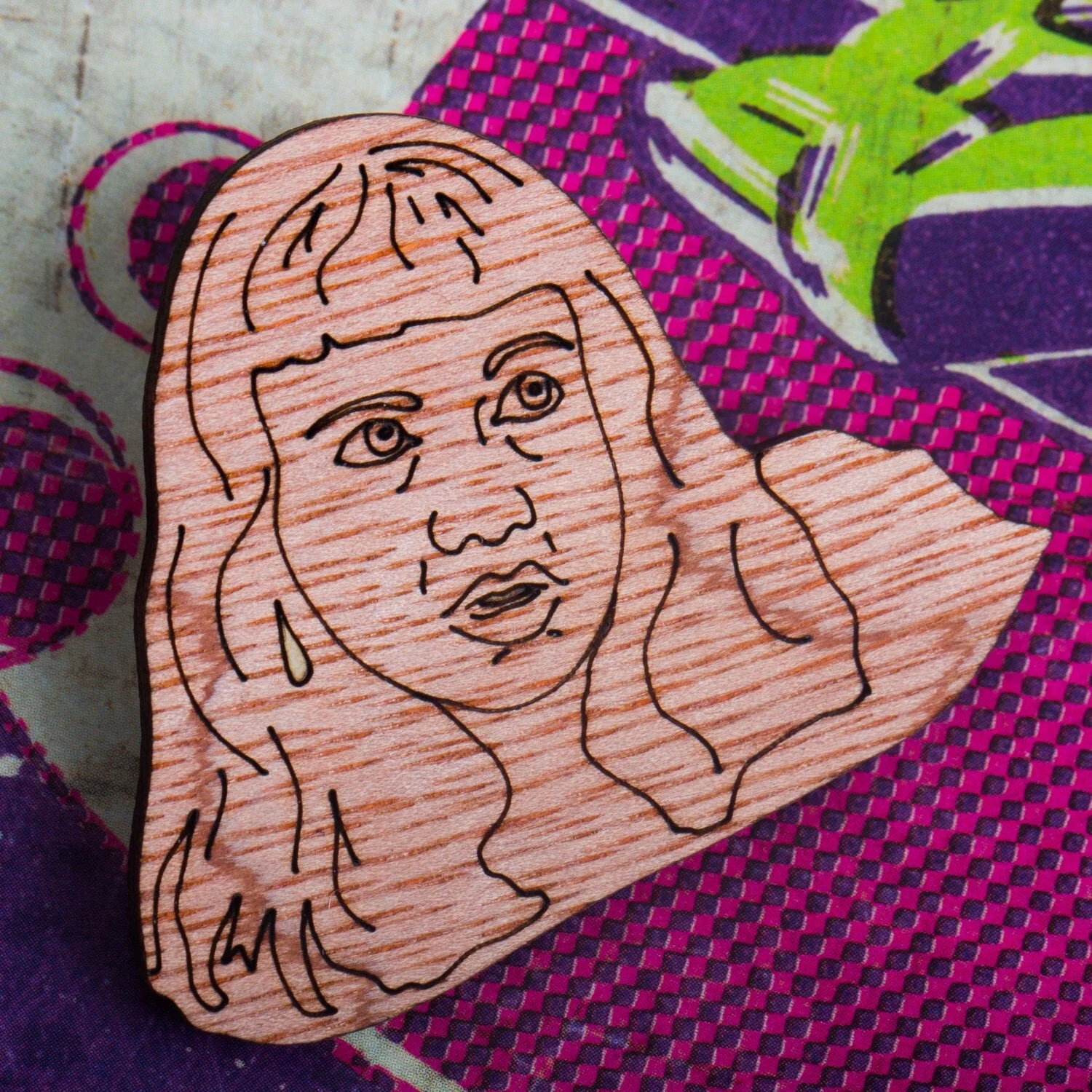 Hand drawn before Bertha, our laser, lovingly etched those unimpressed eyes and that blunt fringe, Janeane can be pinned to your clothes by a brass plated clutch back for true 90s pin game.