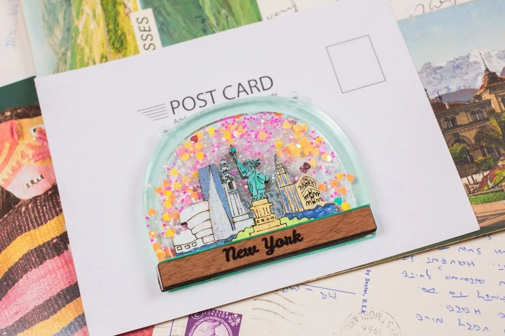 New York landmarks feature in this wintery snow globe necklace. The ever familiar skyline of the Statue of Liberty, the Empire State, Freedom Tower, Guggenheim and Chrysler Building are all included in this statement acrylic necklace. Embrace the cold winters of New York featuring famous NYC landmarks for a contemporary take on the kitsch snow globe souvenir.