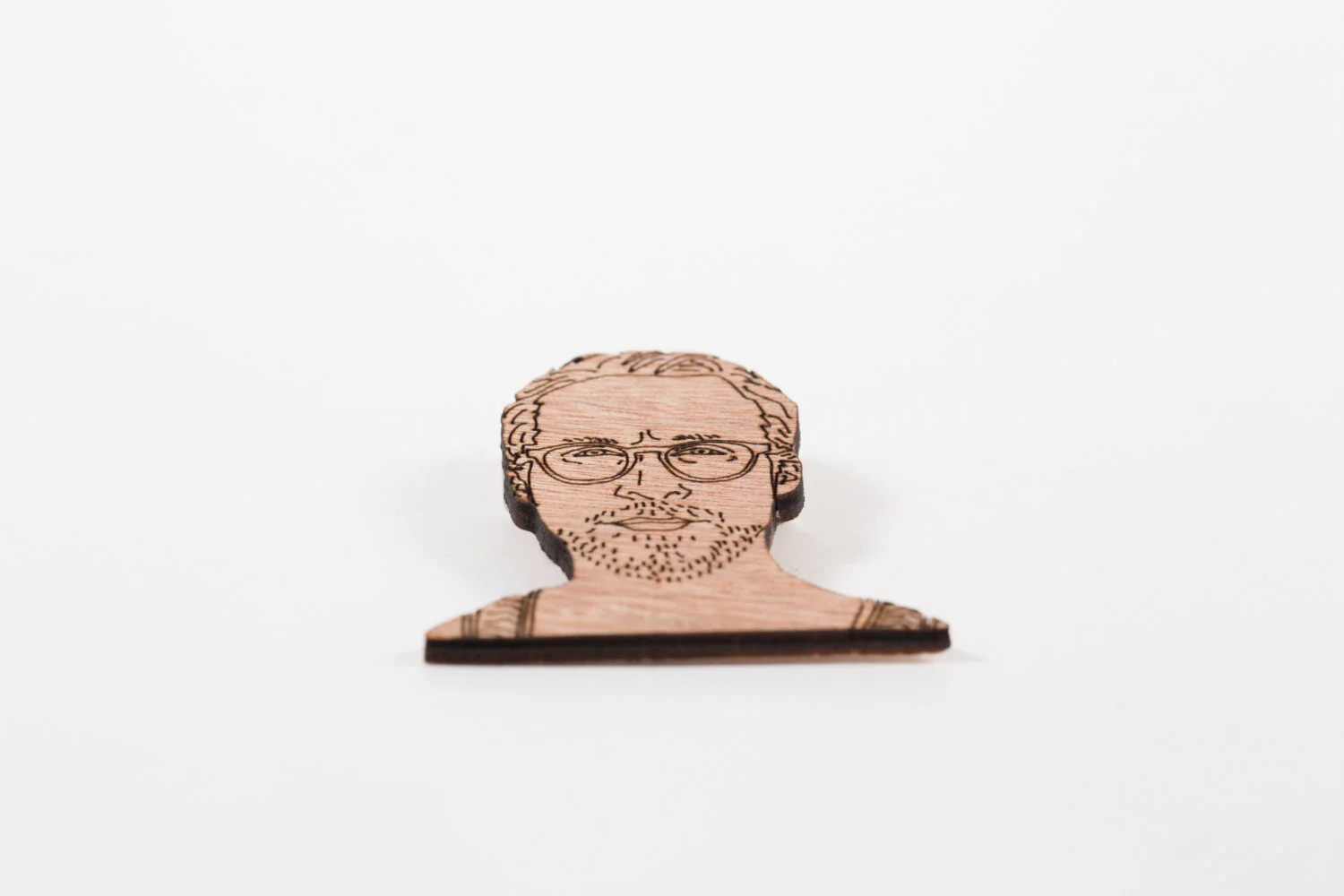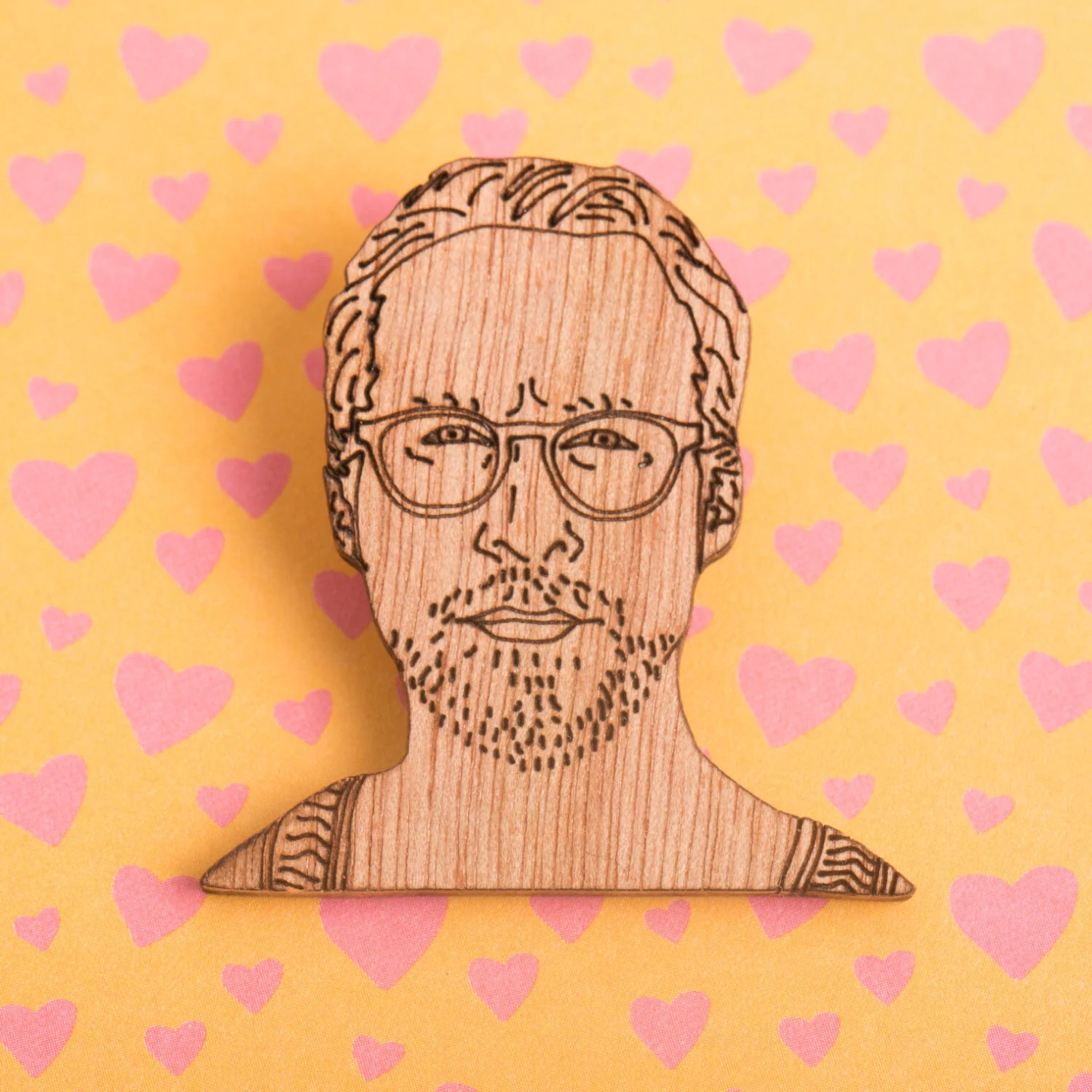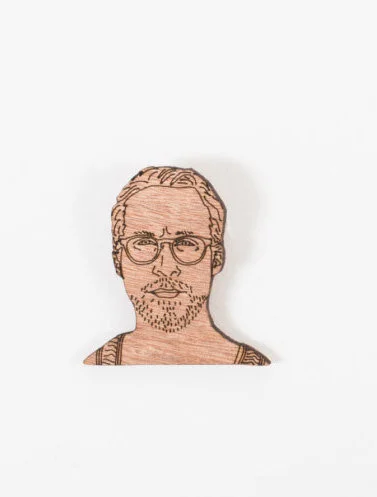 The perfect pin for any Ryan Gosling. Wear this wooden illustrated Ryan on your chest with pride.