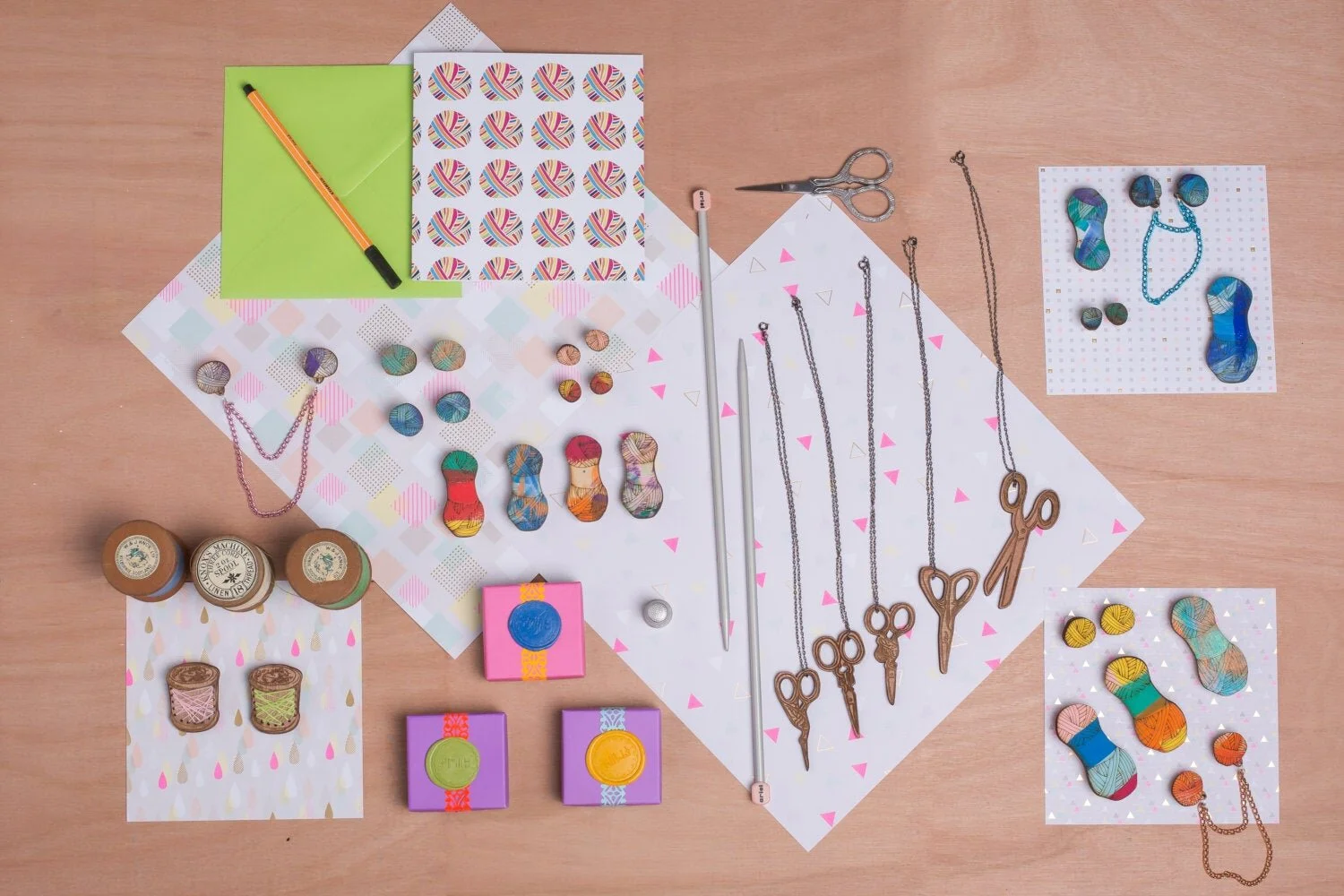 The last picture shows other items in this collection including more scissors, spool brooches, and balls of wool.