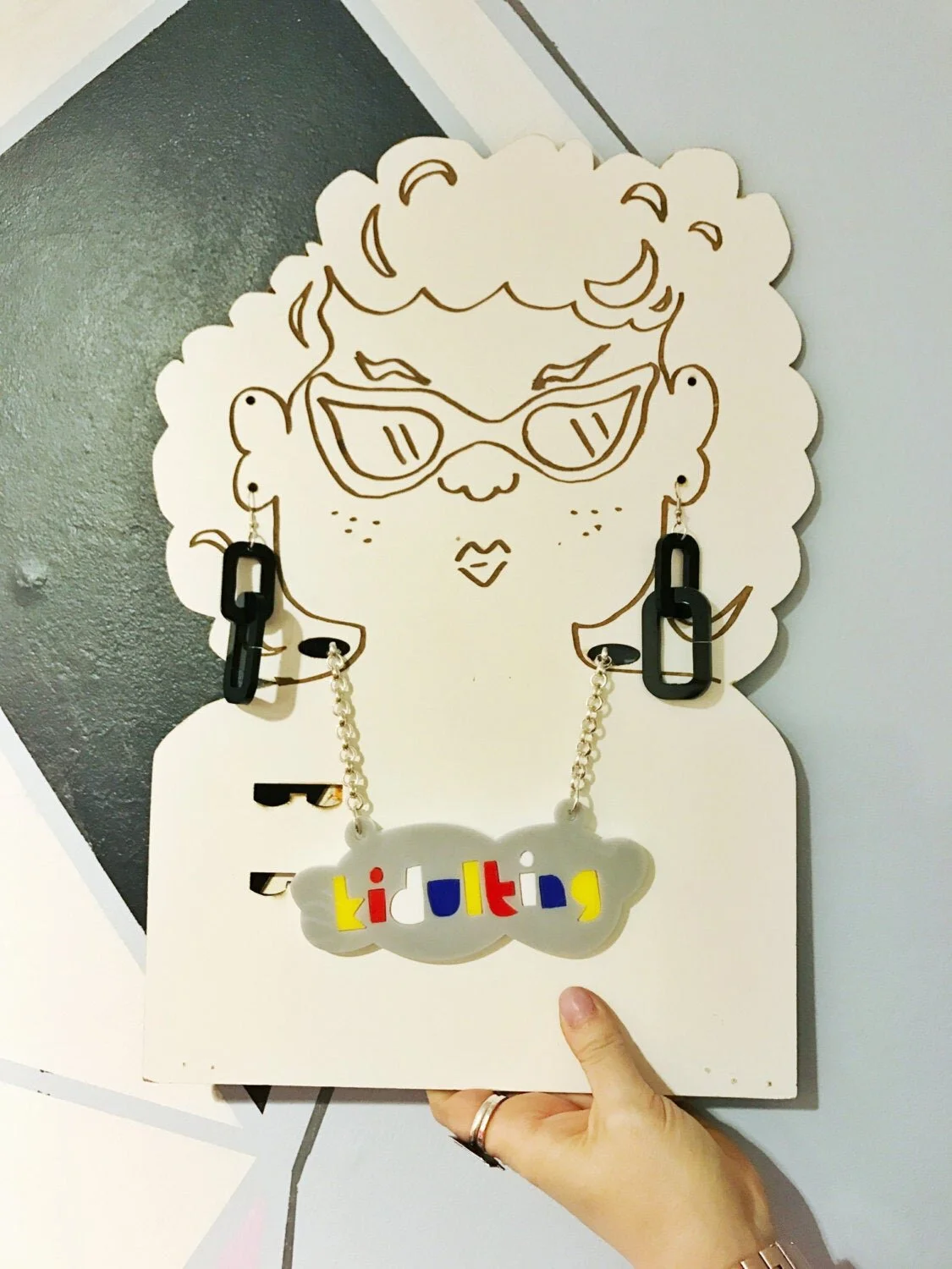 Kidulting is a chunky statement necklace in bold primary colours for those of us who will never grow up! Red, blue, white, grey and yellow acrylic have been combined to create the playful typography of the word, for people who are grown up but still playful!
